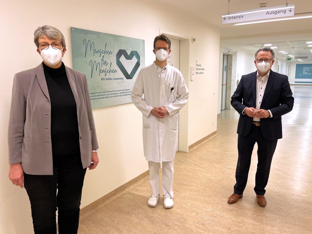 Um an den enormen Zusammenhalt aller zu gedenken, haben die Verantwortlichen große Tafeln vor den Intensivstationen mit der Aufschrift „Menschen für Menschen – wir halten zusammen“ angebracht. „Die Arbeit mit den Kranken ist praktizierte Nächstenliebe, die in unserer oft reizüberfluteten Gesellschaft des ‚Schöner, Größer, Weiter‘ durch die Corona-Pandemie ins verdiente Rampenlicht kam. Die Krise lehrt uns Demut und das, worauf es im Leben wirklich ankommt“, so Düllings.