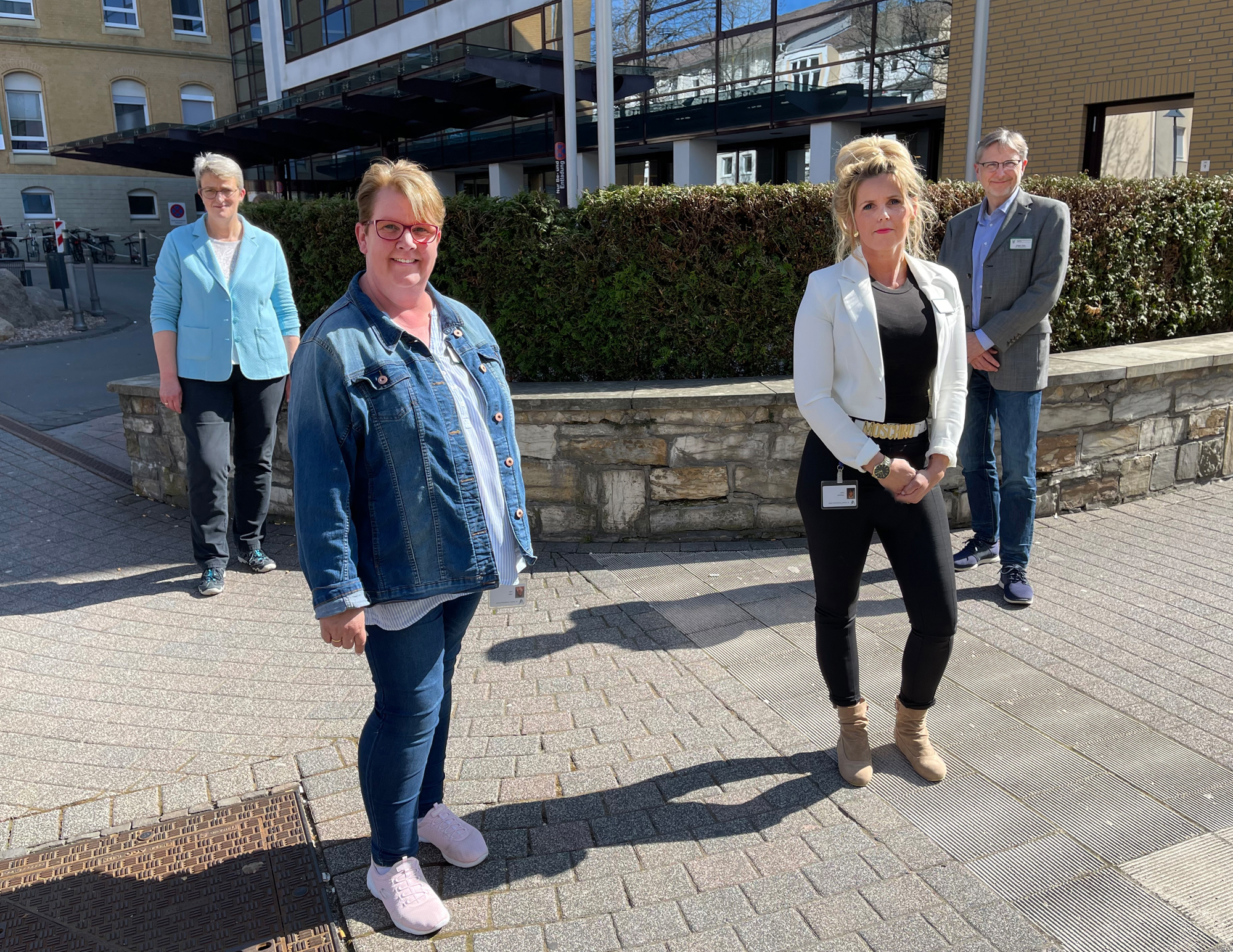 Von links: Marion Schwerthelm (Pflegedirektorin), Lydia Sallen (Pflegerische Leitung des Ambulanten Pflegezentrums), Sarah Pettenpohl (stv. Pflegerische Leitung), Jürgen Thau (kfm. Geschäftsführer der St. Vincenz-Krankenhaus GmbH). Foto: St. Vincenz-Krankenhaus/Böddeker