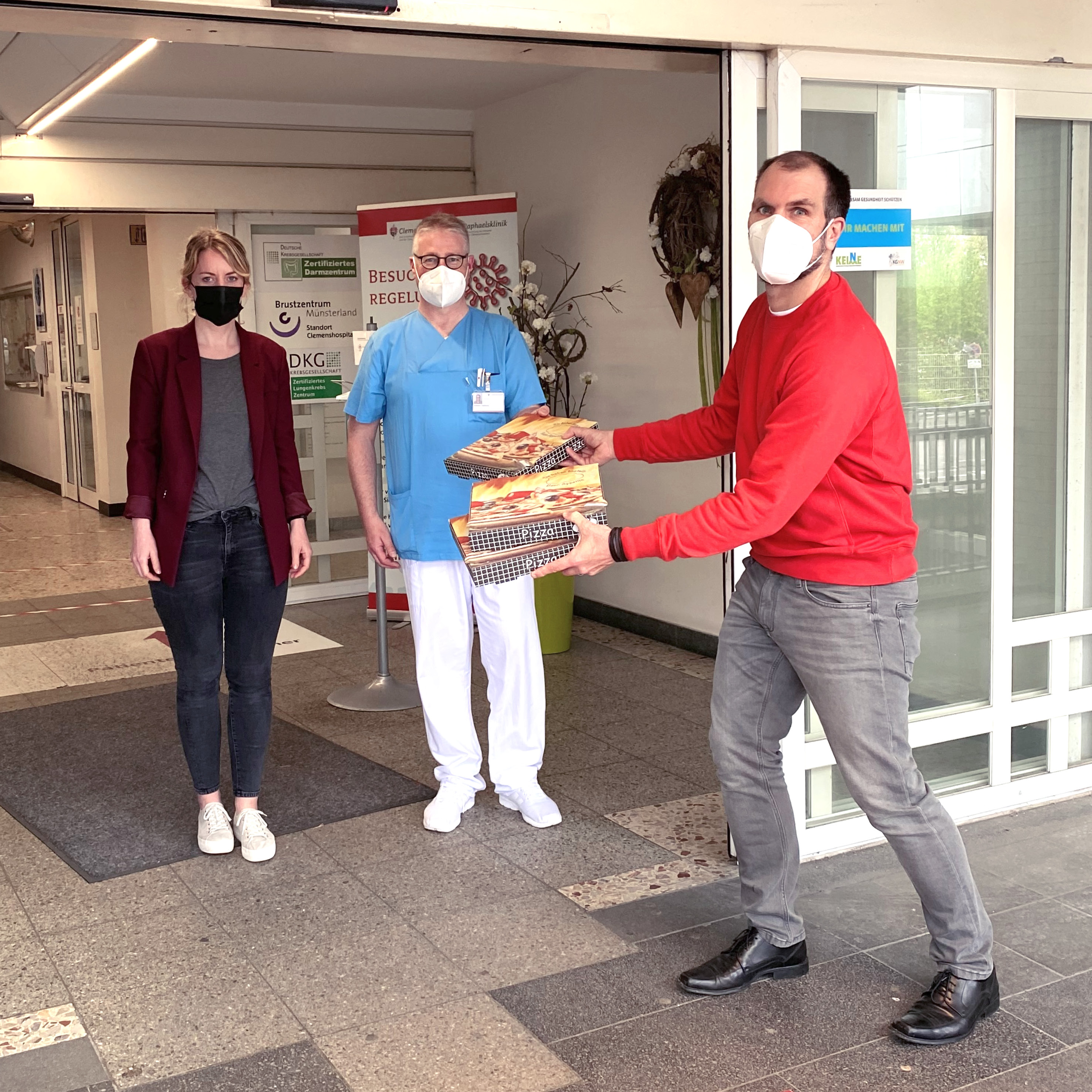 Münster. In den Kartons lagen zwar noch keine frisch gebackenen Pizzen, dennoch war die Freude am Eingang des Clemenshospitals groß. Nils Führmann überreichte dort Pizza-Gutscheine für alle Pflegekräfte der Station 3B an deren Stationsleiter.