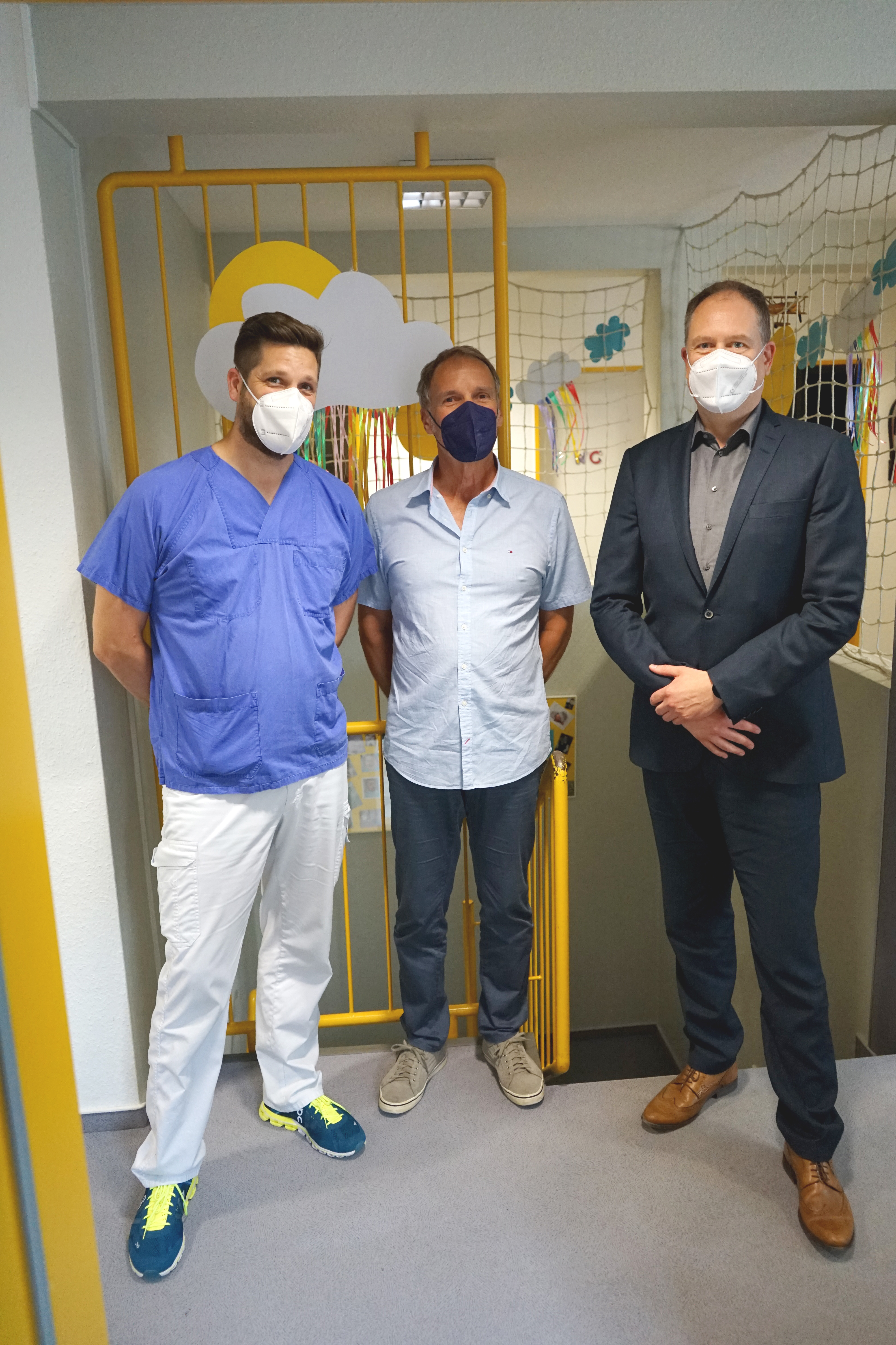 Bild 1: Dr. Luc Del Piero (Mitte), Dr. Christian Sippel (Ärztlicher Leiter mvz Wellersberg GmbH, links) und Carsten Jochum (GF DRK-Kinderklinik Siegen gGmbH und mvz Wellersberg GmbH, rechts) in der Kinderarztpraxis in Geisweid – DRK-Kinderklinik Siegen
