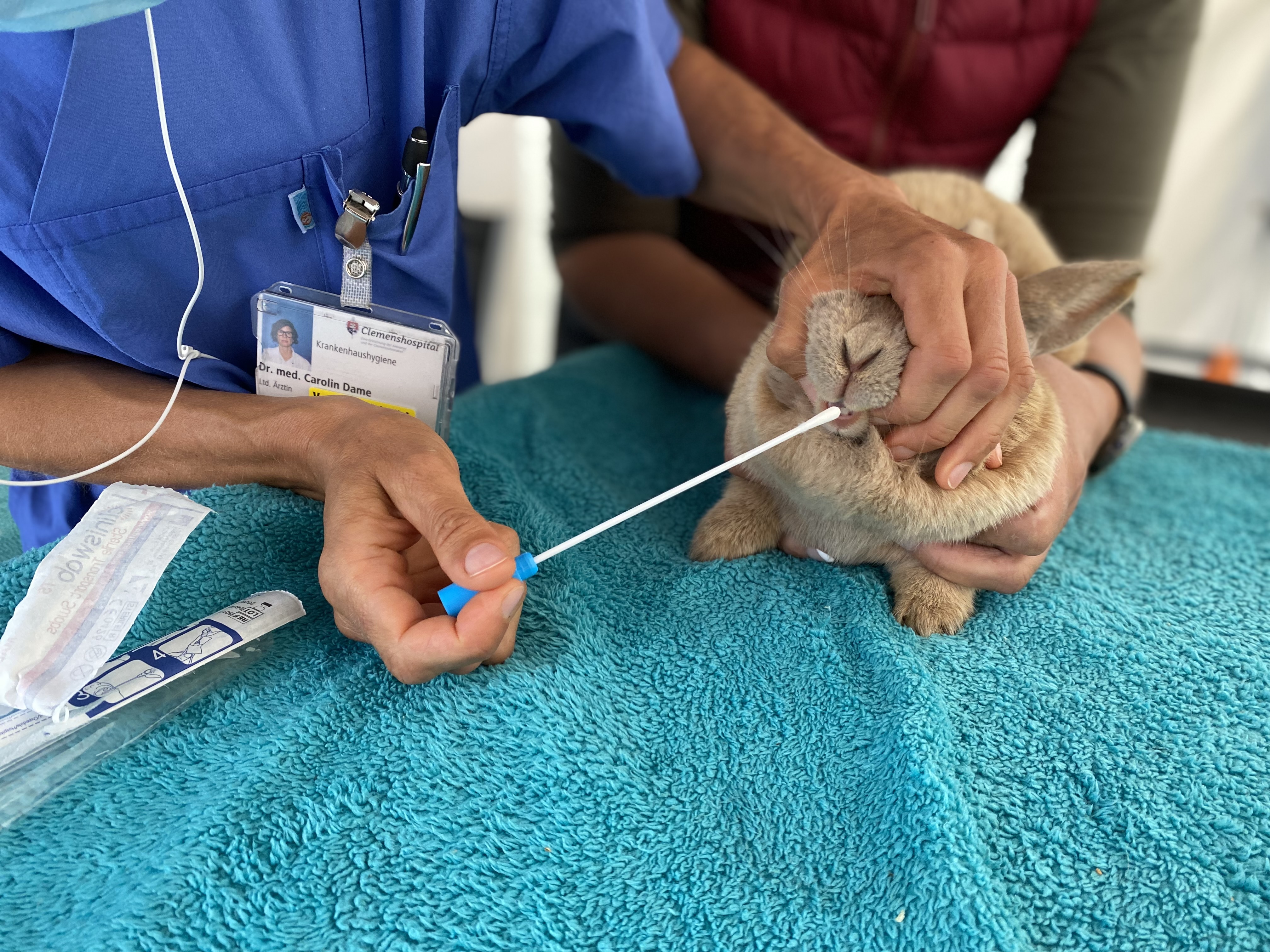 Hygieneärztin Dr. Carolin Dame hatte in der vergangenen Woche ganz besondere Kandidaten für einen Abstrich, denn „Elli“, „Blitz“ und „Wolke“ waren wieselflink, aber trotzdem sehr kooperativ: Die neuen Kaninchen aus der tiergestützten Therapie in der Kinderklinik des Clemenshospitals wurden auf den MRSA-Krankenhauskeim abgestrichen.