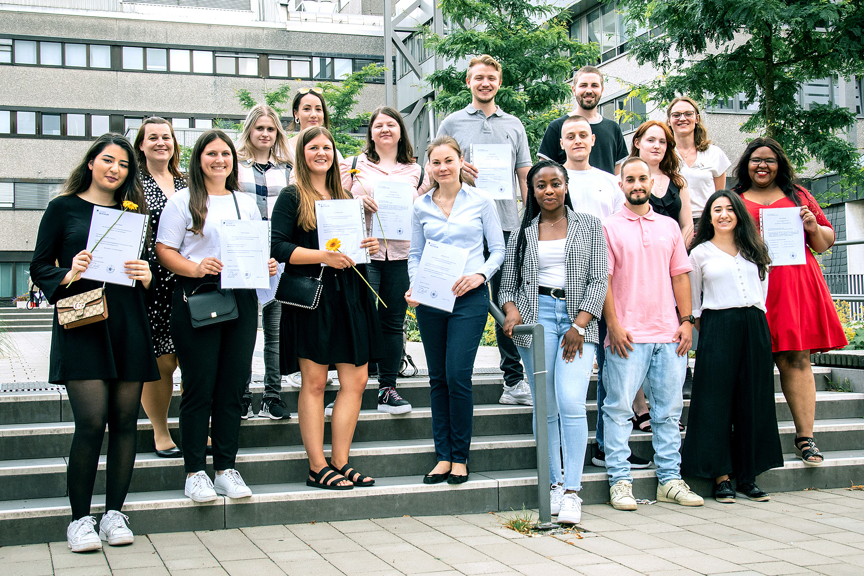 Zu sehen sind: (vordere Reihe v. li.) Bahar Koc, Loredana Golon, Leonie Rinas, Tetiana Kindsvater, Melani Kusi, Leo Bussi, Merve Kara, (hintere Reihe v. li.) Melanie Biendarra (stellv. Schulleitung), Jessica Piontek, Annike Artmeier, Denise Schneyink, John-Arndt Schulte-Elberg, Arthur Krasmik, Tim Poll, Michelle Huber, Clarissa Stott (Kursleitung), Arisleyda Carolina Borbon Duran