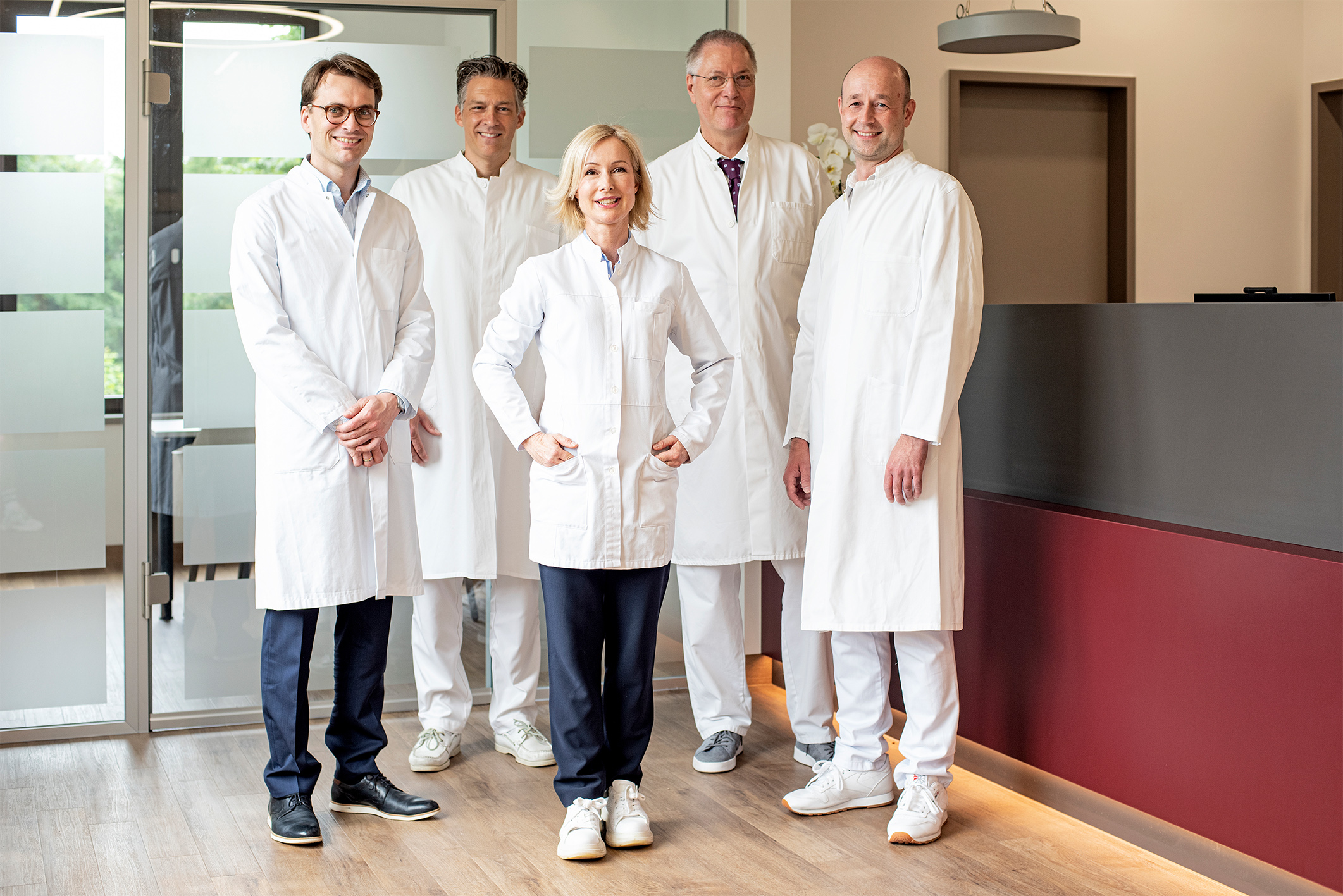 Die Chefärzte des Rheinischen Rheuma-Zentrums am St. Elisabeth-Hospital: (v.l.). Prof. Dr. Stefan Vordenbäumen, Privat-Dozent Dr. Tim Claßen, Dr. Stefanie Freudenberg, Dr. Florian Danckwerth und Dr. Daniel Jockenhöfer (Foto: Simon Erath).