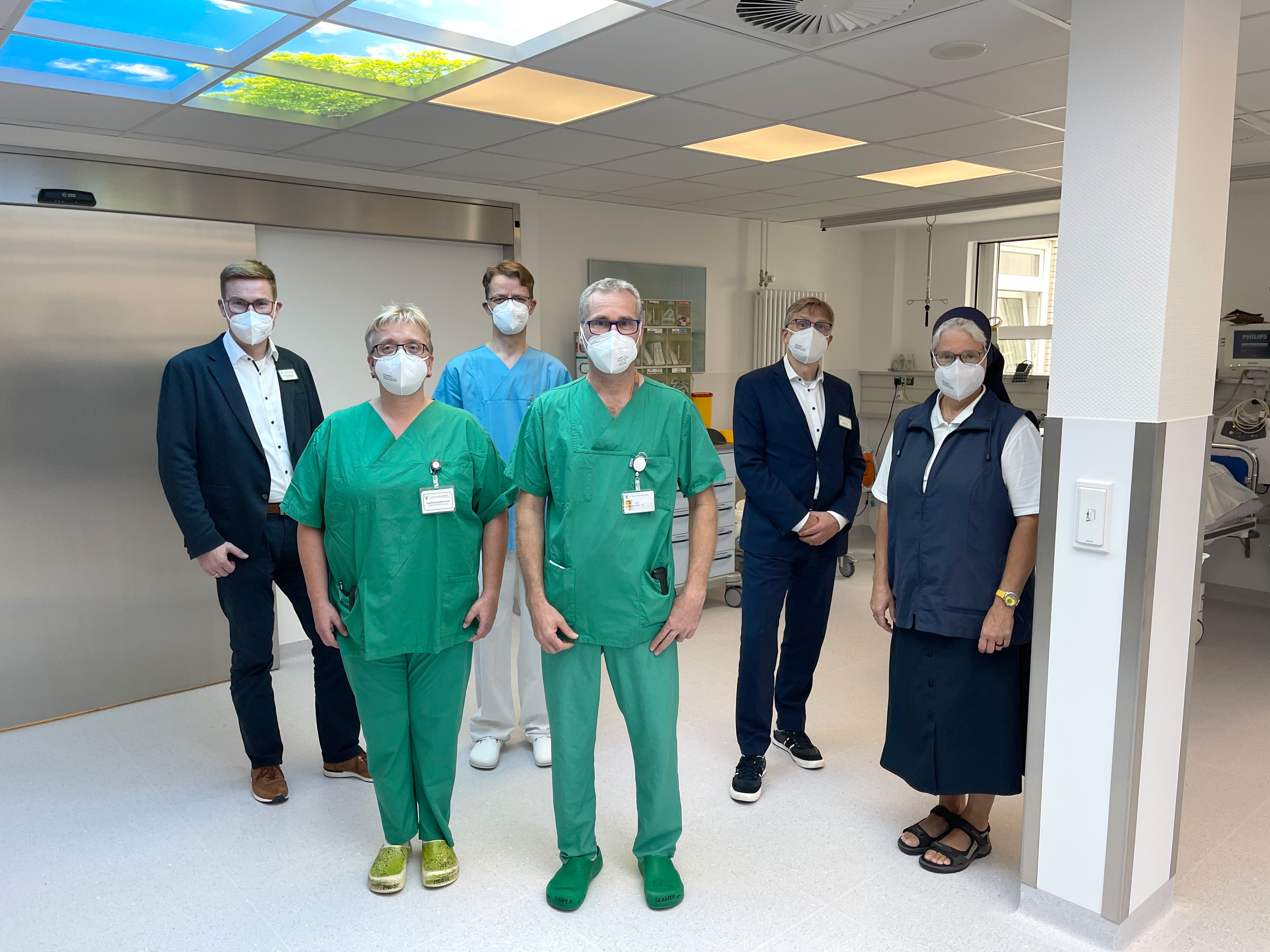 „Wir freuen uns, dass wir die letzte Etappe dieses Großprojekts jetzt erfolgreich abschließen konnten. Nun sind auch die erforderlichen Nebenräume wie der Aufwachraum, OP-Schleusen, Umkleiden und ein großer Pausenraum für die Mitarbeiter einsatzbereit“, erklärt Markus Schröder, Technischer Direktor der St. Vincenz-Kliniken. Unter Federführung von Breithaupt Architekten (Andreas Breithaupt, Salzkotten) waren rund 14 regionale Unternehmen an der Fertigstellung des Anbaus beteiligt. „Schwerpunkt des letzten Bauabschnittes war der Aufwachraum, der gleichzeitig als sogenannte ‚Holding-Area‘ fungiert. In diesem besonderen Warteraum betreuen wir die Patienten vor der Operation, bereiten sie in Ruhe auf den Eingriff vor und überwachen sie auch nach dem Eingriff intensiv. Die Patienten werden bereits frühzeitig von der Station in die Holding-Area verlegt, sodass zwischen den verschiedenen Operationen nur kurze Wartezeiten entstehen“, erklärt Dr. Martin Baur, Ärztlicher Direktor der St. Vincenz-Kliniken und Chefarzt der Klinik für Anästhesiologie, operative Intensivmedizin und Schmerztherapie.