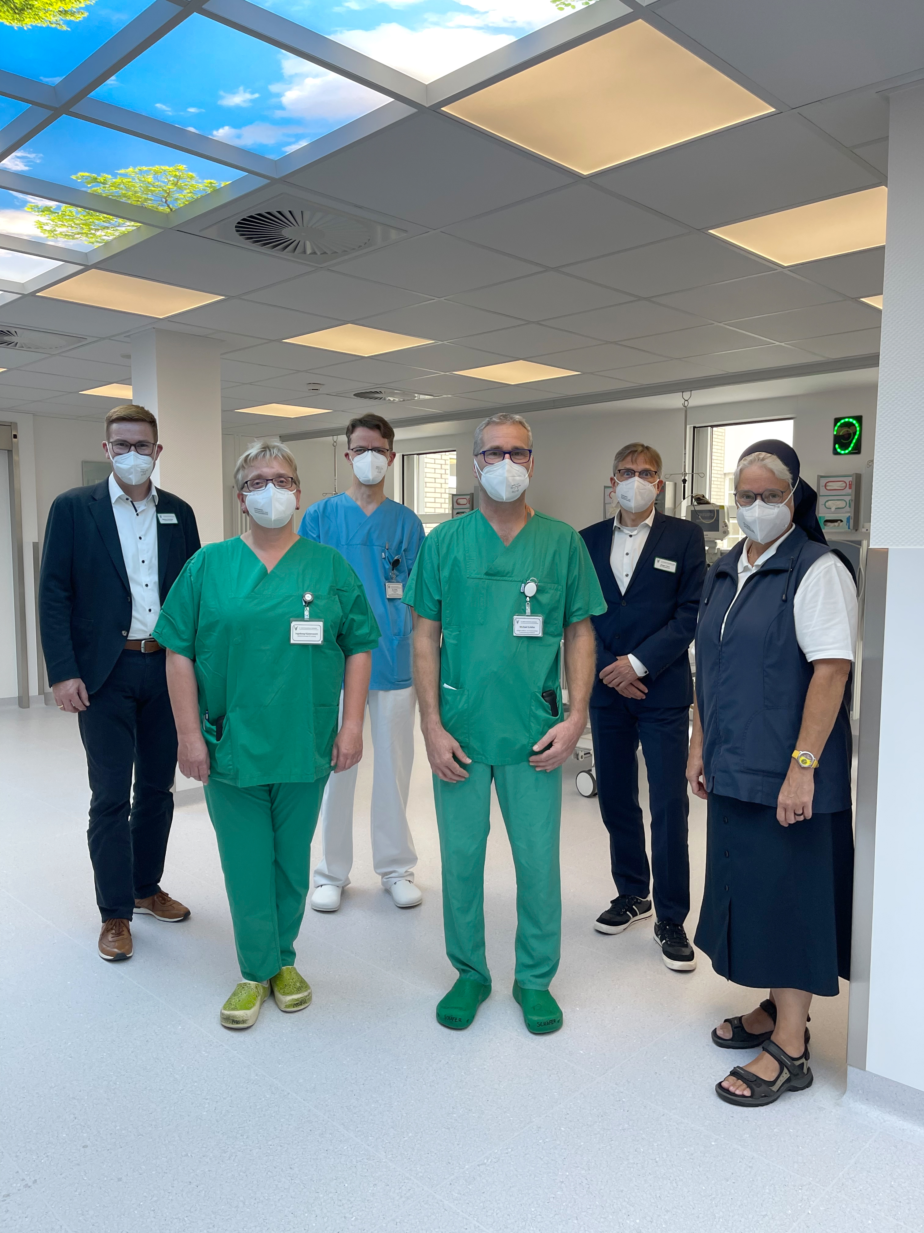 von links: Markus Schröder (Technischer Direktor), Dr. Martin Baur (Ärztlicher Direktor und Chefarzt der Klinik für Anästhesiologie, operative Intensivmedizin und Schmerztherapie), Jürgen Thau (Kaufmännischer Geschäftsführer) sowie vorne von links: Schwester Bernadette M. Putz (Geschäftsführerin), Ingeborg Küsterarent (stv. Funktionsleitung OP), Michael Schäfer (Funktionsleitung Anästhesie-Pflege). Foto: St. Vincenz-Kliniken/Böddeker