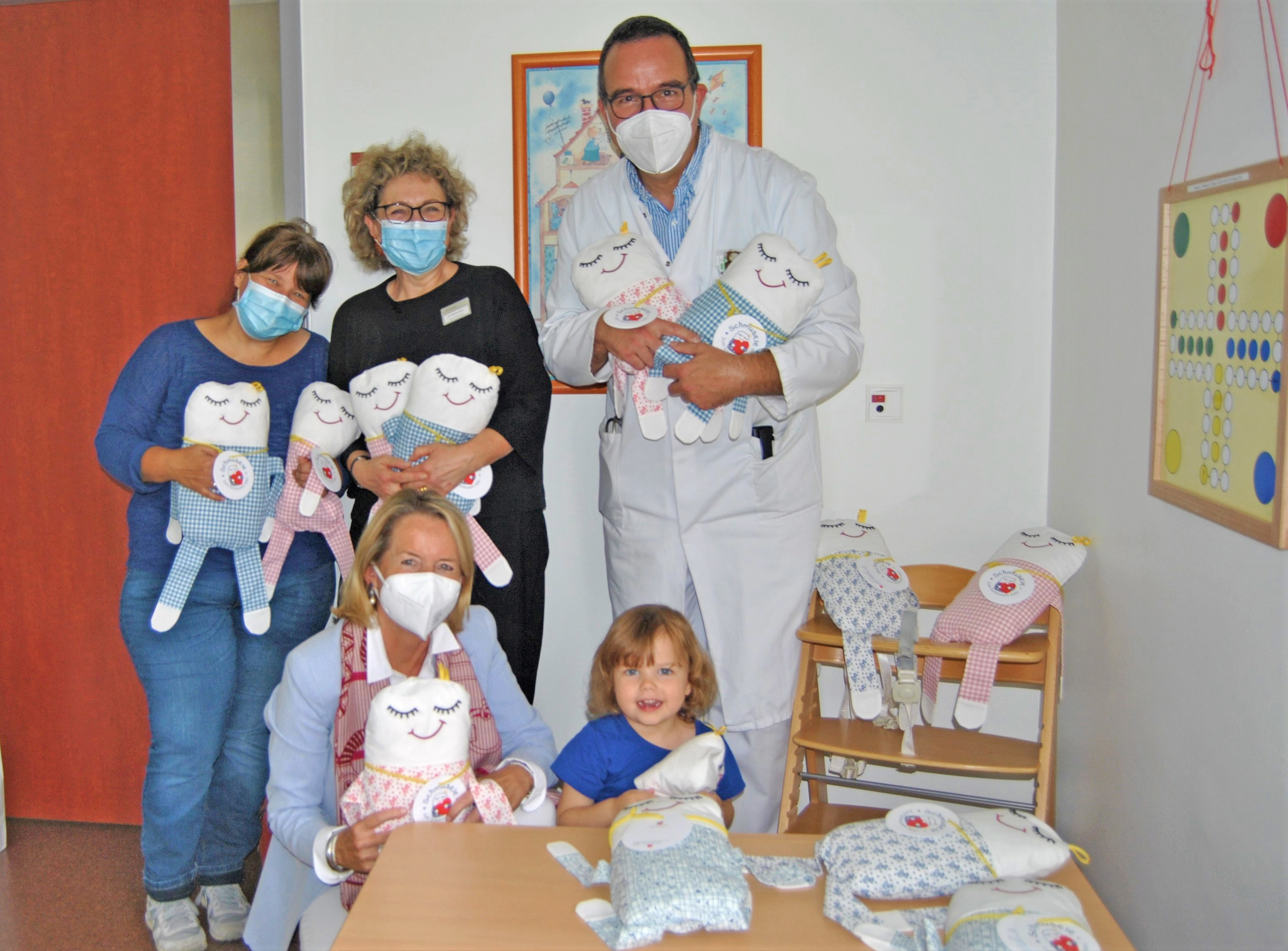CLE_Schmuserle: Zusammen mit der kleinen Kristin freuten sich (v.l.) Case-Managerin Martina Lewin, Dr. Martina Klein (Alexianer Fundraising) und Priv.-Doz. Dr. Otfried Debus (Chefarzt) über viele schöne Schmuserle-Kissen, die Annette Moormann (vorne) nebst Geldspende in der Kinderstation am Clemenshospital überreichte.
