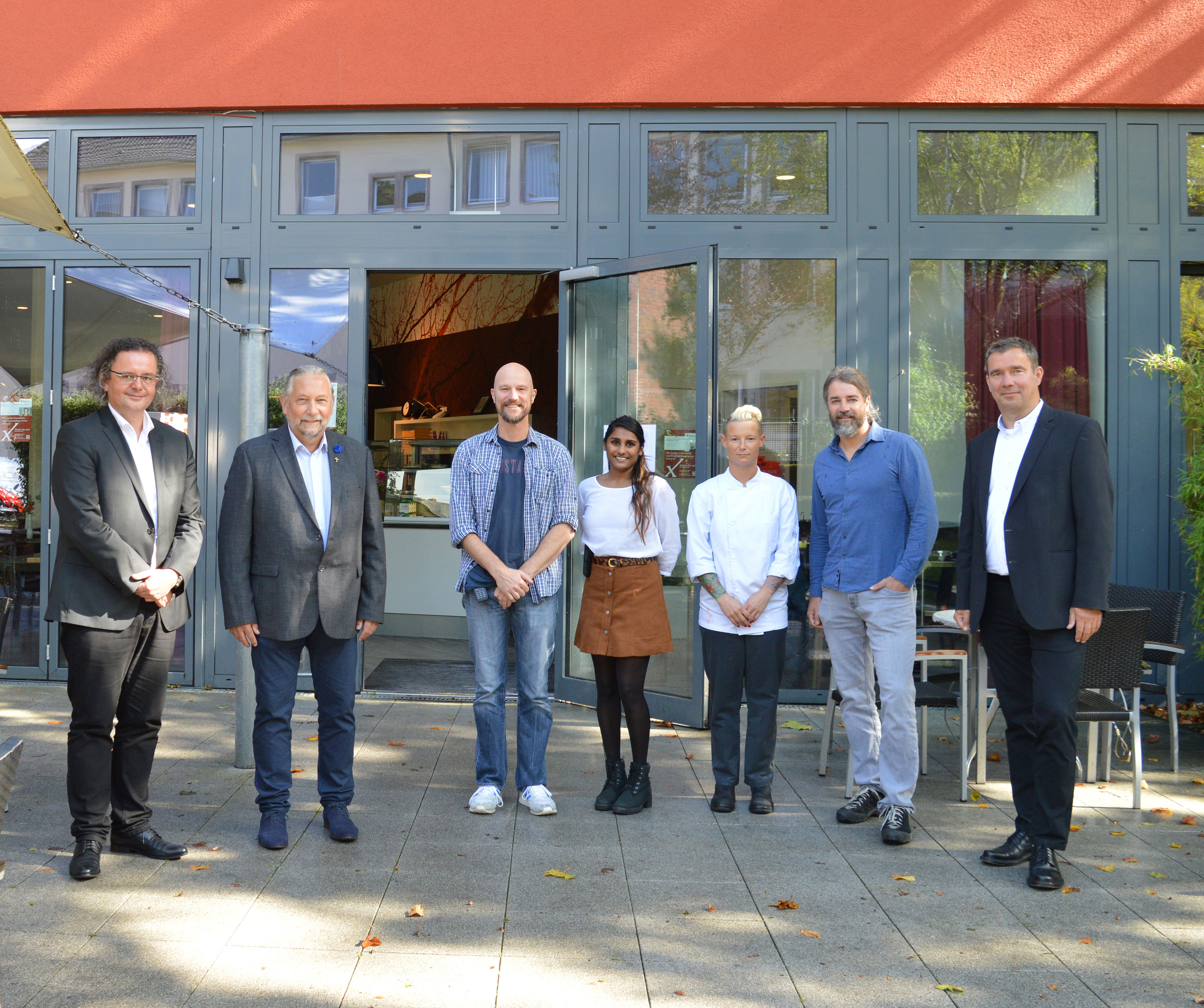 Foto: (v. r. n. l.) Martin Minten, Regionalgeschäftsführung Alexianer Aachen GmbH; Dirk Triphaus, Leitung Ergotherapie und Tagesstruktur; Stefanie Meß, Köchin; Lavanya Dammers, Ergotherapeutin; Klaus Kaiser, Stabsstelle Gastronomie; Eckhard Weimer, Diakon, evangelischer Seelsorger; Thomas Hoff, Diakon, Ordensvertretung und Seelsorge/Ethik