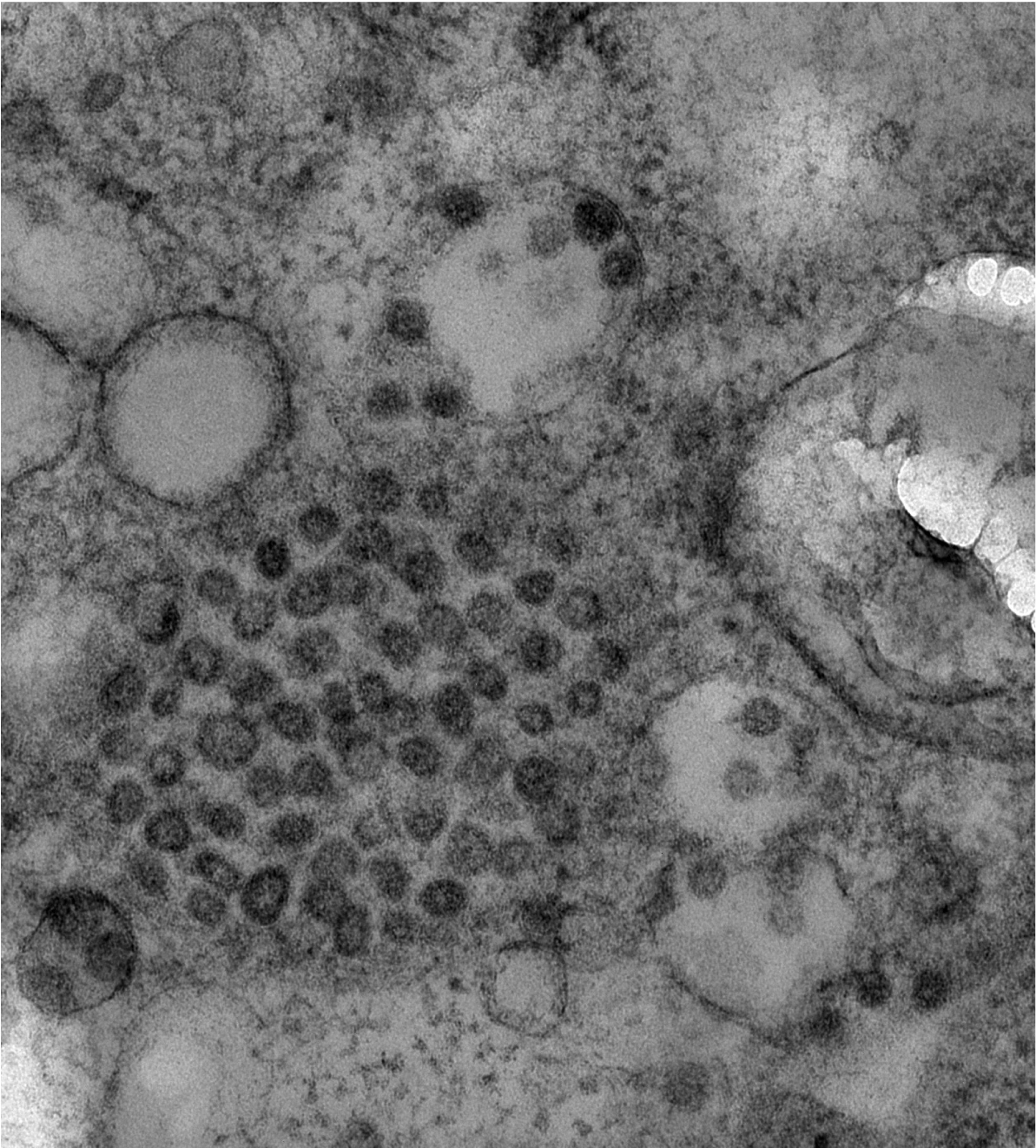 Bild 2: SARS-CoV-2 Partikel in einer Zelle eines Nierenorganoids.