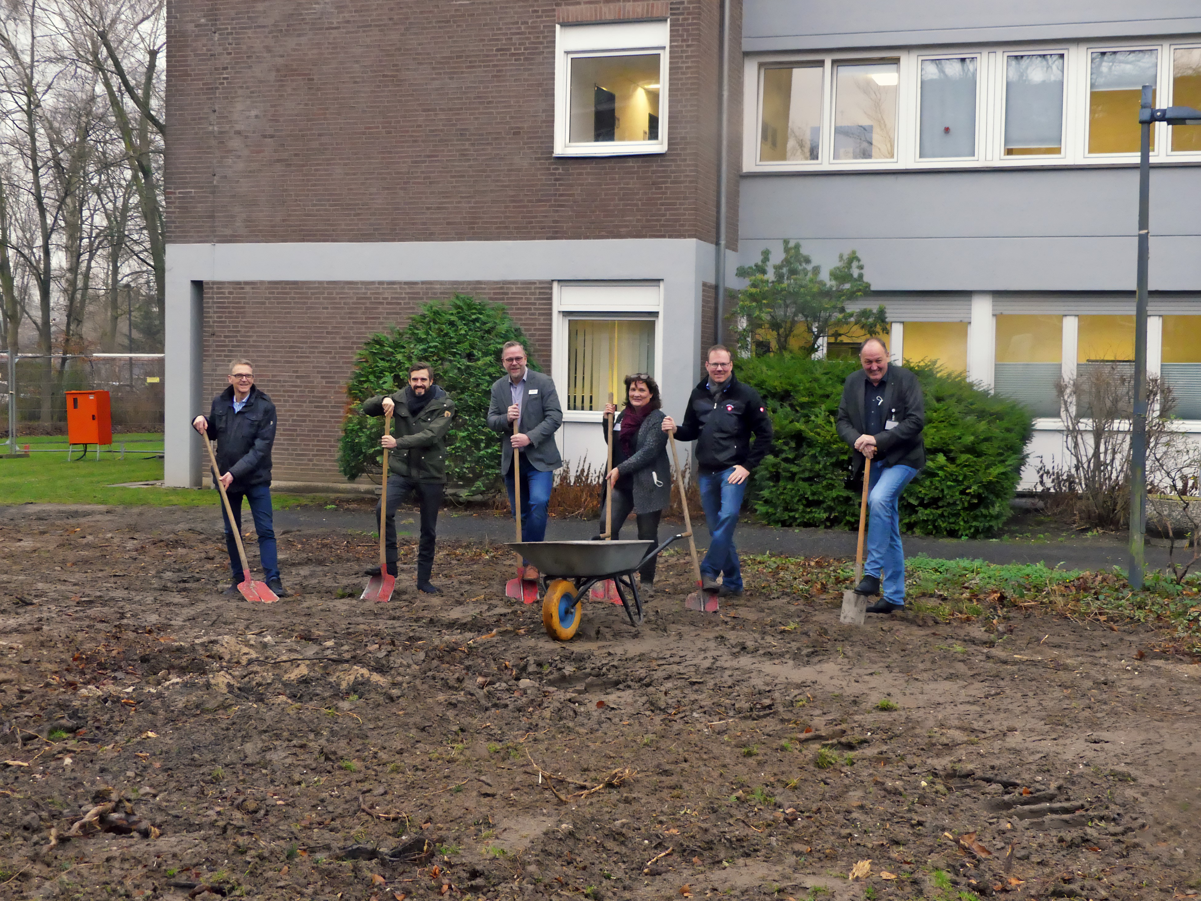 Bildunterzeile: Beim Spatenstich zur Erweiterung der Katholischen Bildungsakademie Niederrhein (v. li.): Clemens Roeling, Thomas Denker, Mario Gerdes, Beate Kramer, Andre Geurtz und Thomas Weyers. (Foto: SBK/priv.)