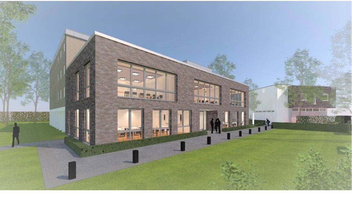 Die Bauplanung sieht vor, dass das Schulgebäude zweigeschossig angebaut wird. Auf insgesamt 530 m² entstehen dann im Erdgeschoss zwei weitere geräumige Klassenräume und ein neuer Bürobereich. Im Obergeschoss wird es zukünftig drei Gruppenräume geben, die durch Faltwände zu einem großen Multifunktionsraum umgestaltet werden können. „Hier sind dann auch große Veranstaltungen möglich“, erklärt Andre Geurtz, Leiter der Katholischen Bildungsakademie Niederrhein. Im Obergeschoss entsteht außerdem ein modernes Lehrerzimmer sowie weitere Büroräume für die Lehrkräfte. Ein großzügig und modern gestalteter Eingangsbereich mit neuem Treppenhaus verbindet die beiden Gebäudeteile.