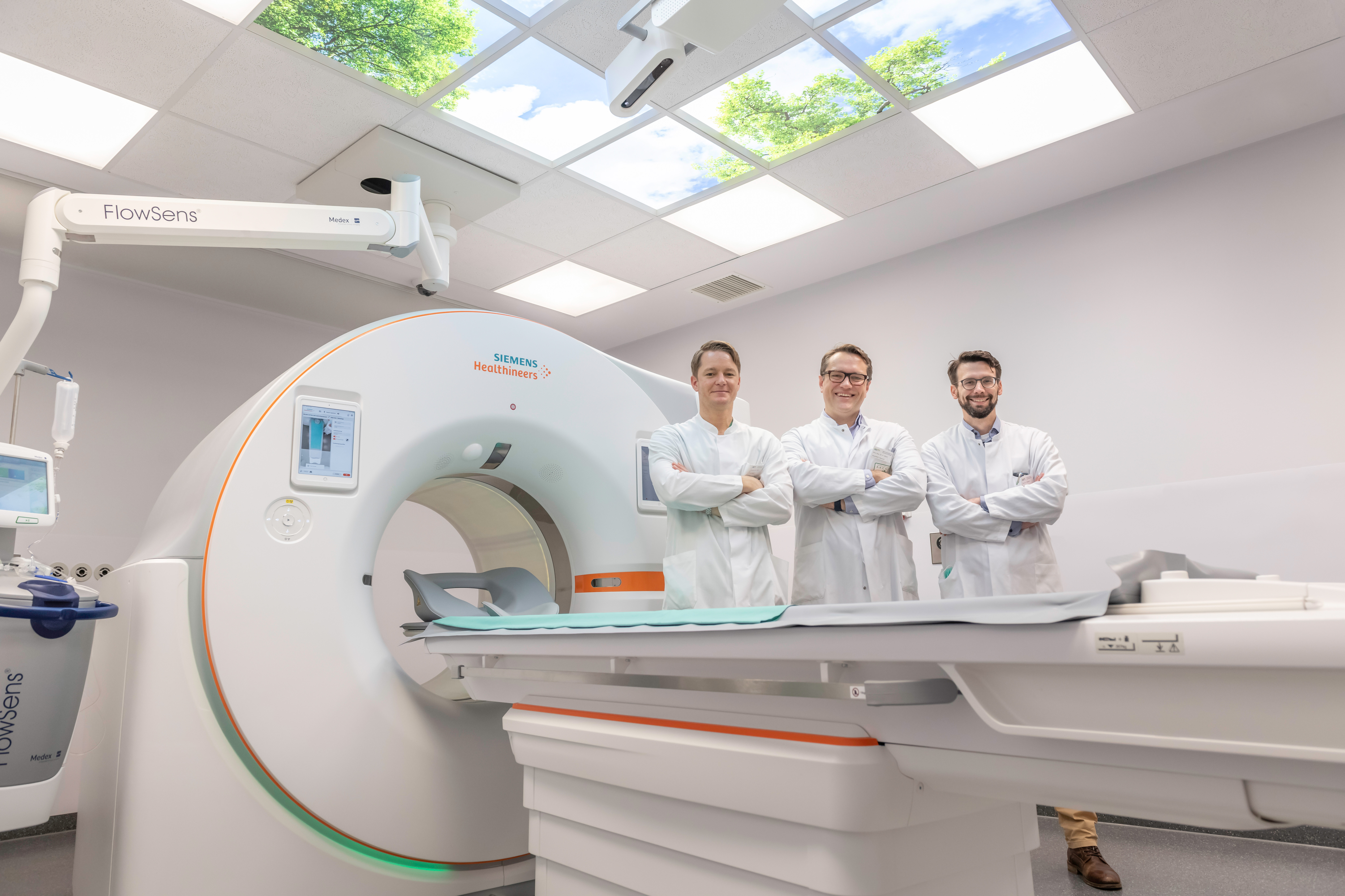 v. l.: Prof. Dr. med. Sebastian Keil, Vertreter des Stellvertretenden Klinikdirektors, Prof. Dr. med. Peter Isfort, Geschäftsführender Oberarzt, und Prof. Dr. med. Philipp Bruners, Stellvertretender Klinikdirektor, haben im September 2021 die Arbeit mit dem innovativen Photon-Counting-CT aufgenommen.