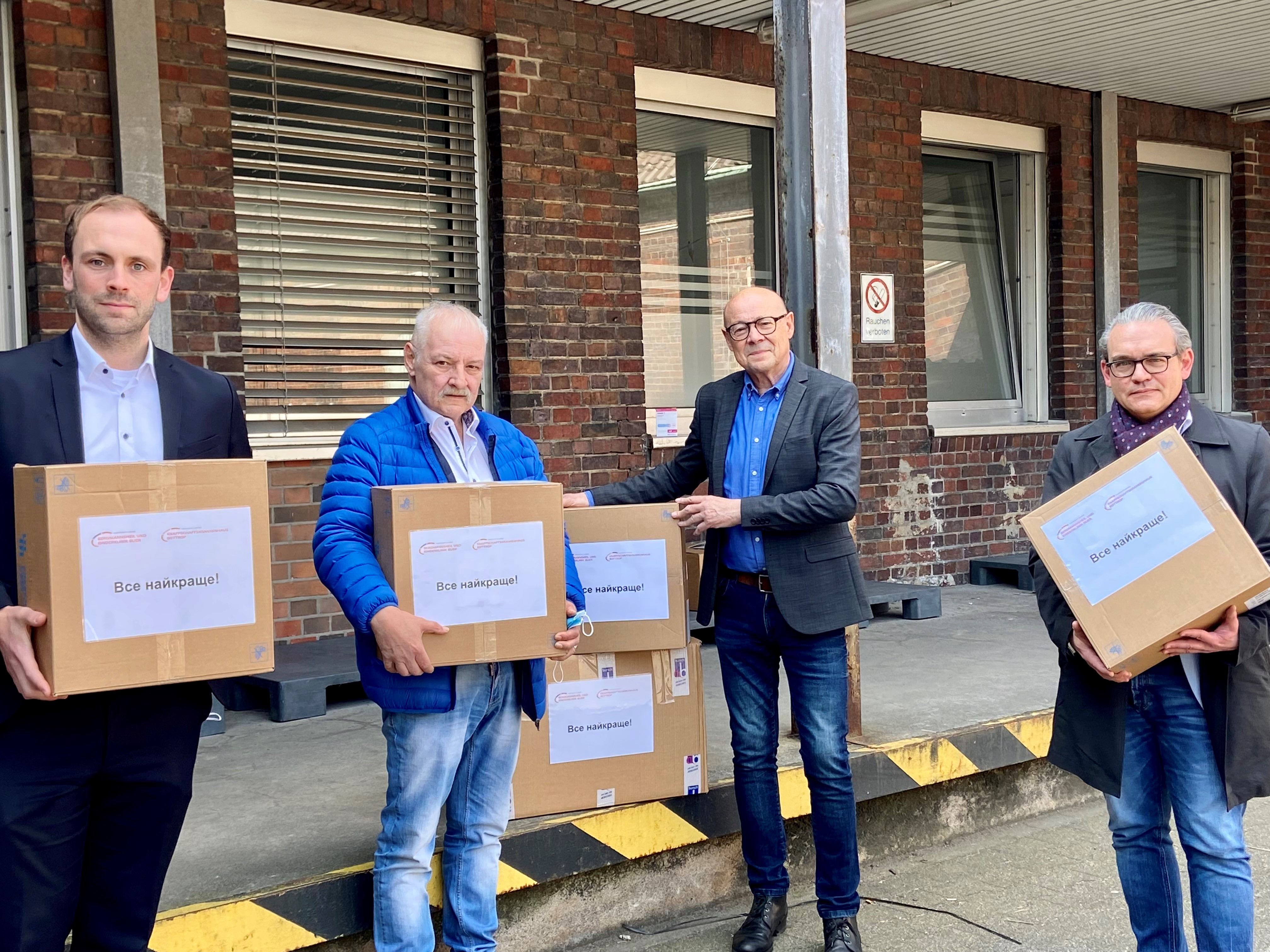 Bild (v.l.n.r.): Jonas Wintz (Bergmannsheil und Kinderklinik Buer), Jürgen Hansen, Manfred Peters (Aufsichtsratsmitglied Bergmannsheil und Kinderklinik Buer GmbH) und Stefan Grave (Knappschaftskrankenhaus Bottrop) bei der Übergabe der medizinischen Hilfsgüter.