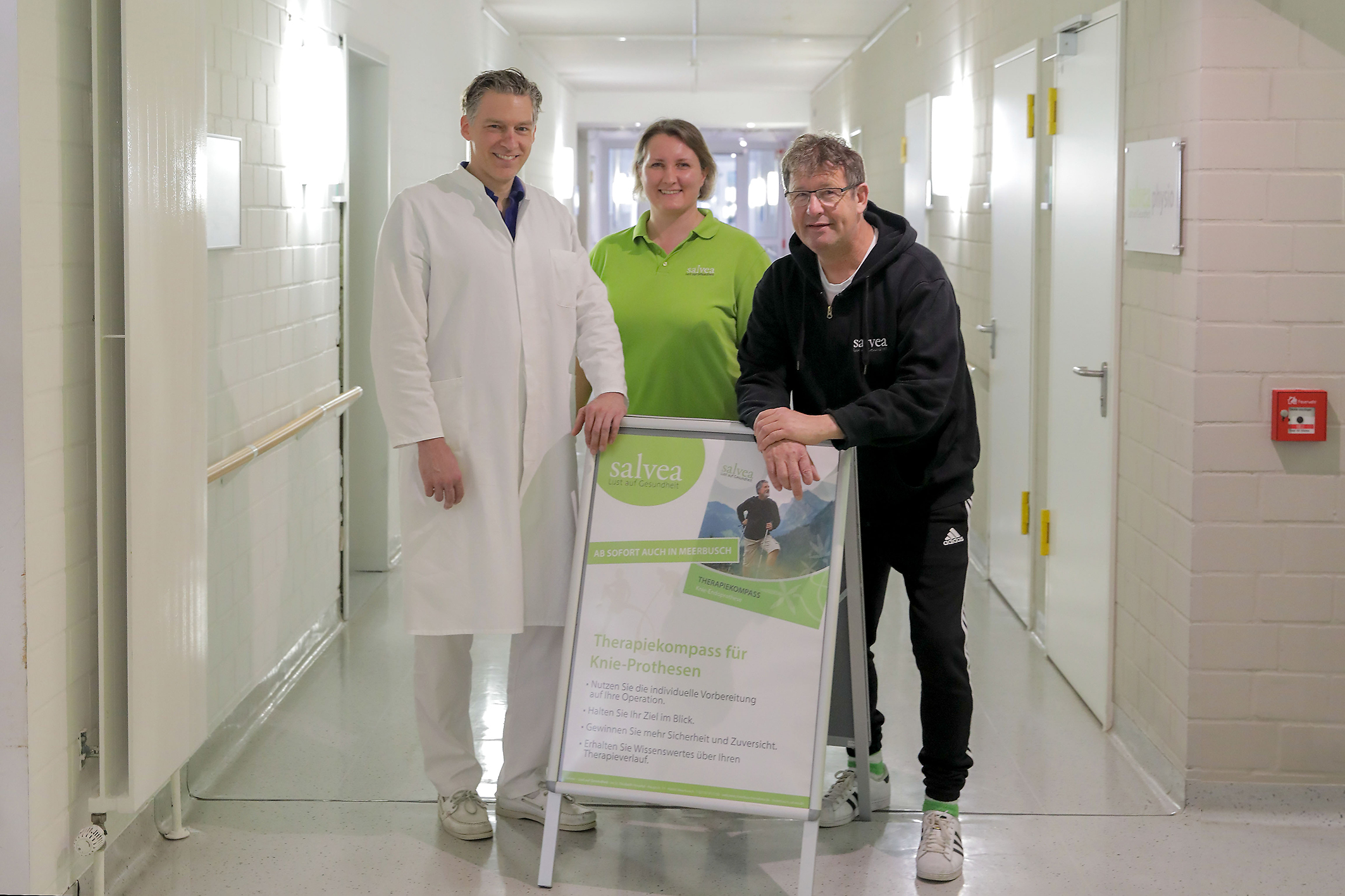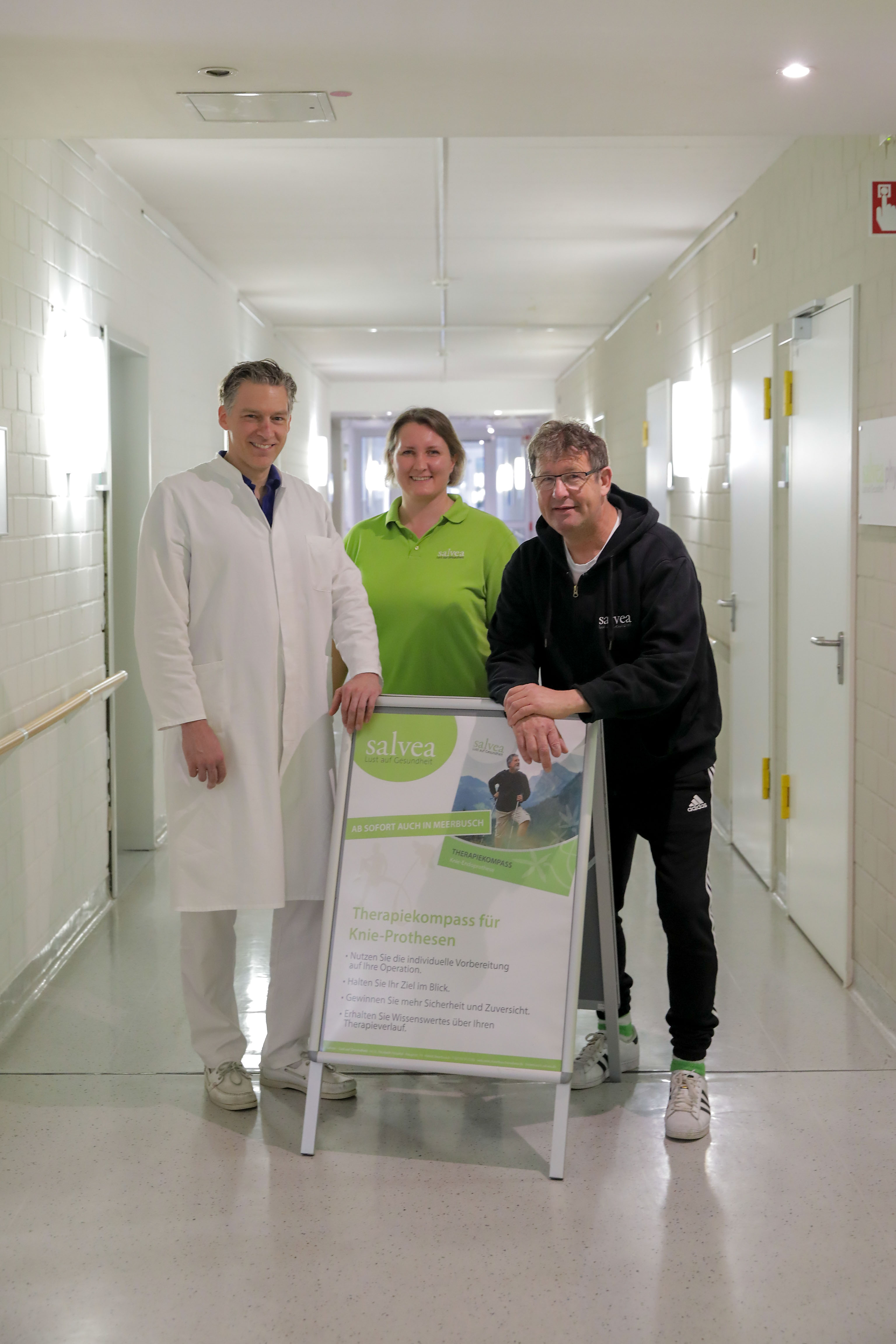 Gemeinsam bereiten sie mit dem Therapiekompass die Patienten auf eine Knie-Operation im St. Elisabeth-Hospital Meerbusch-Lank vor: Chefarzt Privat-Dozent Dr. Tim Claßen, Astrid Fichte und Erwin Elsbernd, beide Betriebsstättenleitung salvea am St. Elisabeth-Hospital Meerbusch-Lank.