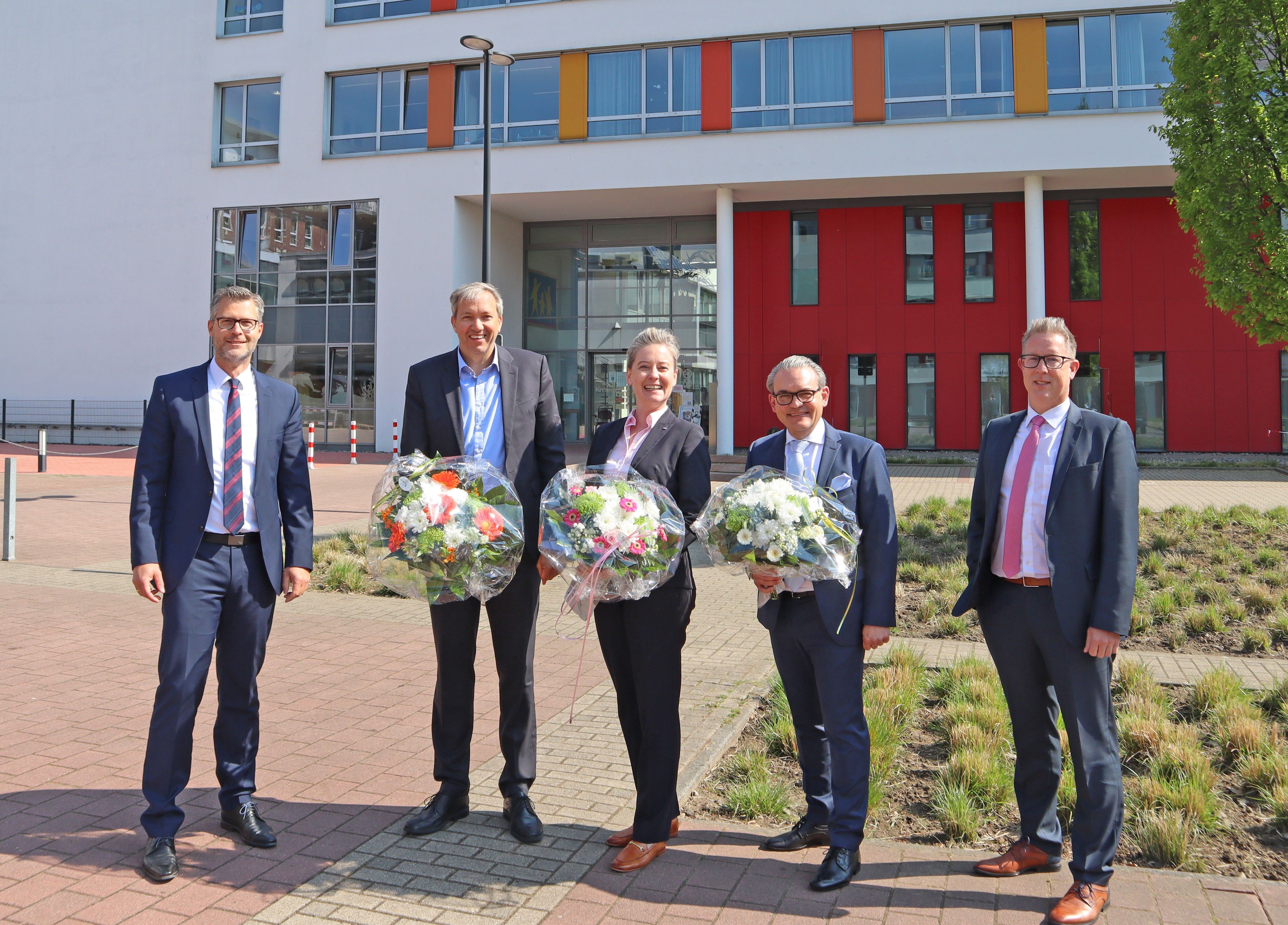Klinikgeschäftsführer Dr. André Schumann (li.) gratulierte mit Michael Weberink (re.), alternierender Vorstandsvorsitzender der Knappschaft-Bahn-See und Mitglied im BKB-Aufsichtsrat, dem neuen BKB-Aufsichtsratsvorsitzenden, Andreas Schlüter (Hauptgeschäftsführer der Knappschaft Kliniken GmbH/ 2.v.re.) und seiner Stellvertreterin Frau Andrea Henze (Sozialdezernentin von Gelsenkirchen). Ab 1. Mai 2022 tritt Stefan Grave (2.v.li.) in die Geschäftsführung der BKB ein und verantwortet dann das Operative Management.
