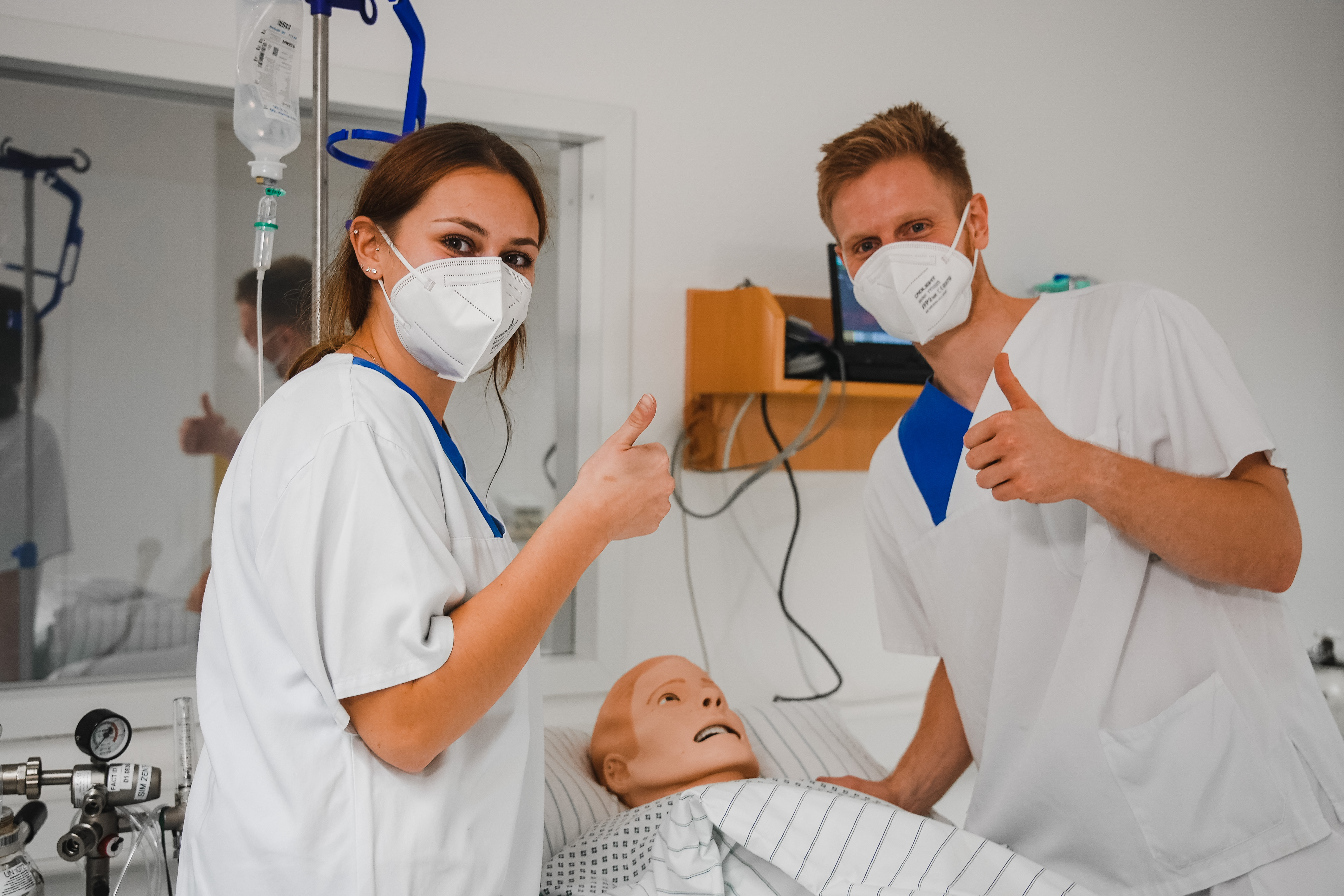 Marius Breuer, Pflegefachmann in der Zentralen Notaufnahme des St. Franziskus-Hospitals Münster, üben eine Notfallsituation im Simulationszentrum.