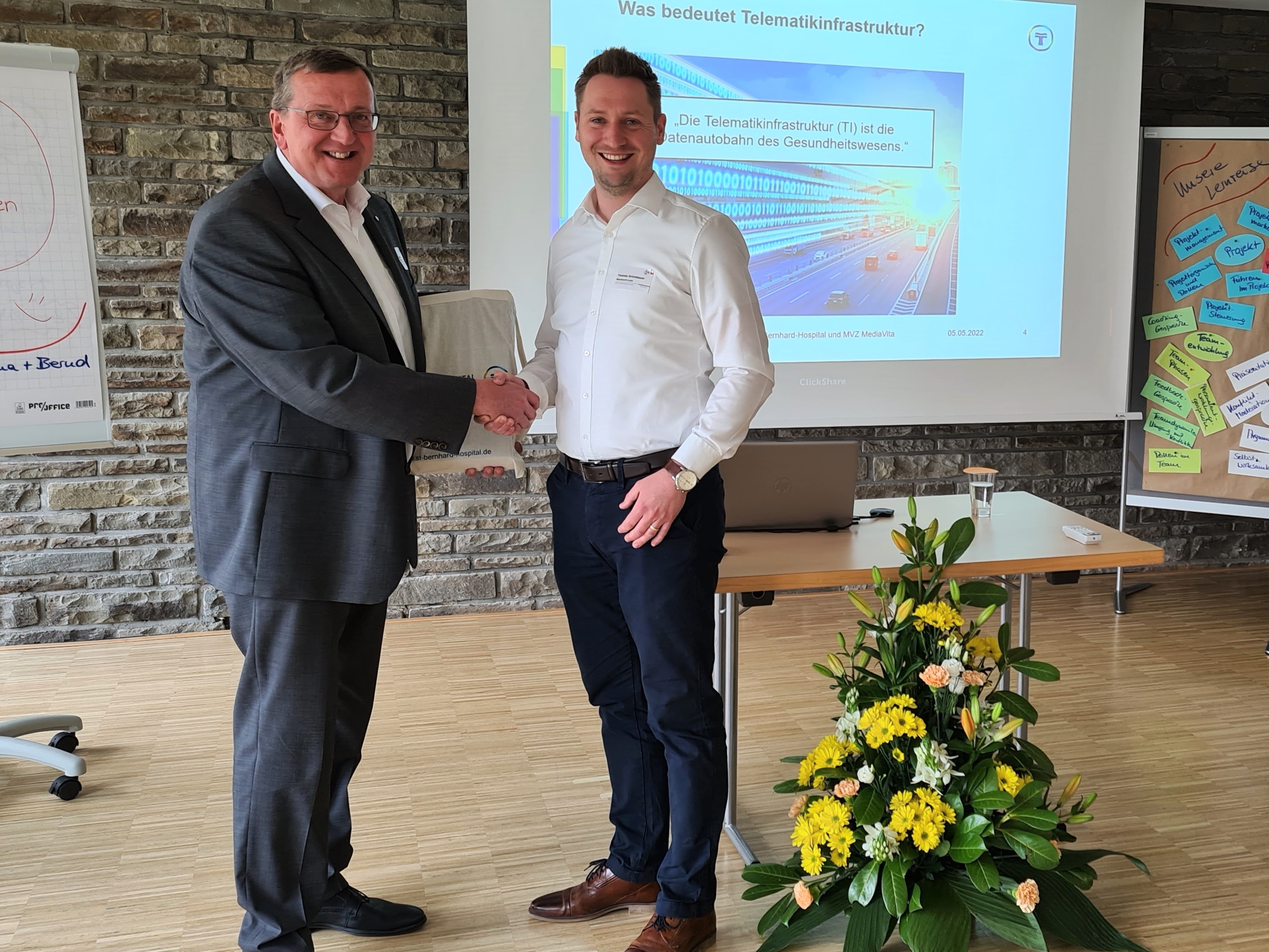 Seit 2017 gehört Thomas Grünebaum zur Region Rheinland der St. Franziskus-Stiftung. Er startete eine Trainee-Ausbildung und lernte dabei alle drei rheinischen Stiftungs-Häuser in Meerbusch, Süchteln und Kamp-Lintfort kennen. Als er mit seiner Fortbildung begann, war er als Controller im St. Elisabeth-Hospital in Meerbusch tätig. Der damalige Kaufmännische Direktor, Peter Potysch, empfahl ihm diese Weiterbildung, die er selbst, aber auch Josef Lübbers, der Geschäftsführer des St. Bernhard-Hospitals, bereits absolviert hatte. Jedes der sechs Module wurde im Blockunterricht eine Woche lang vermittelt – durch Corona allerdings oft digital.