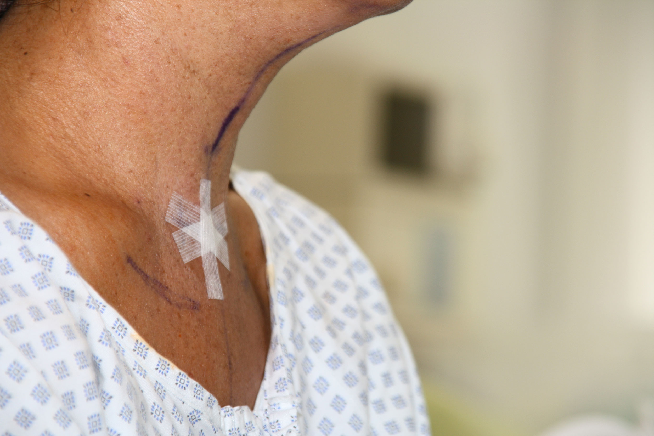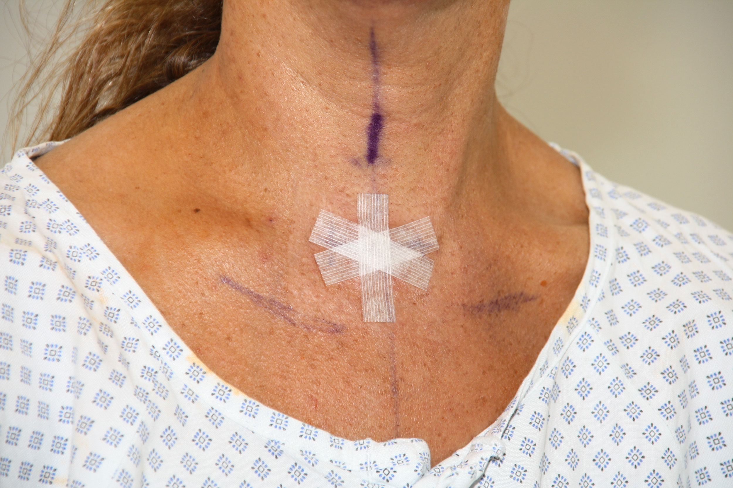 Eine der so operierten Patientinnen erlaubte es freundlicherweise, den Eingriff und Ihren Hals einen Tag nach dem Eingriff zu fotografieren. Wie man sieht, gab es keine Schwellung!