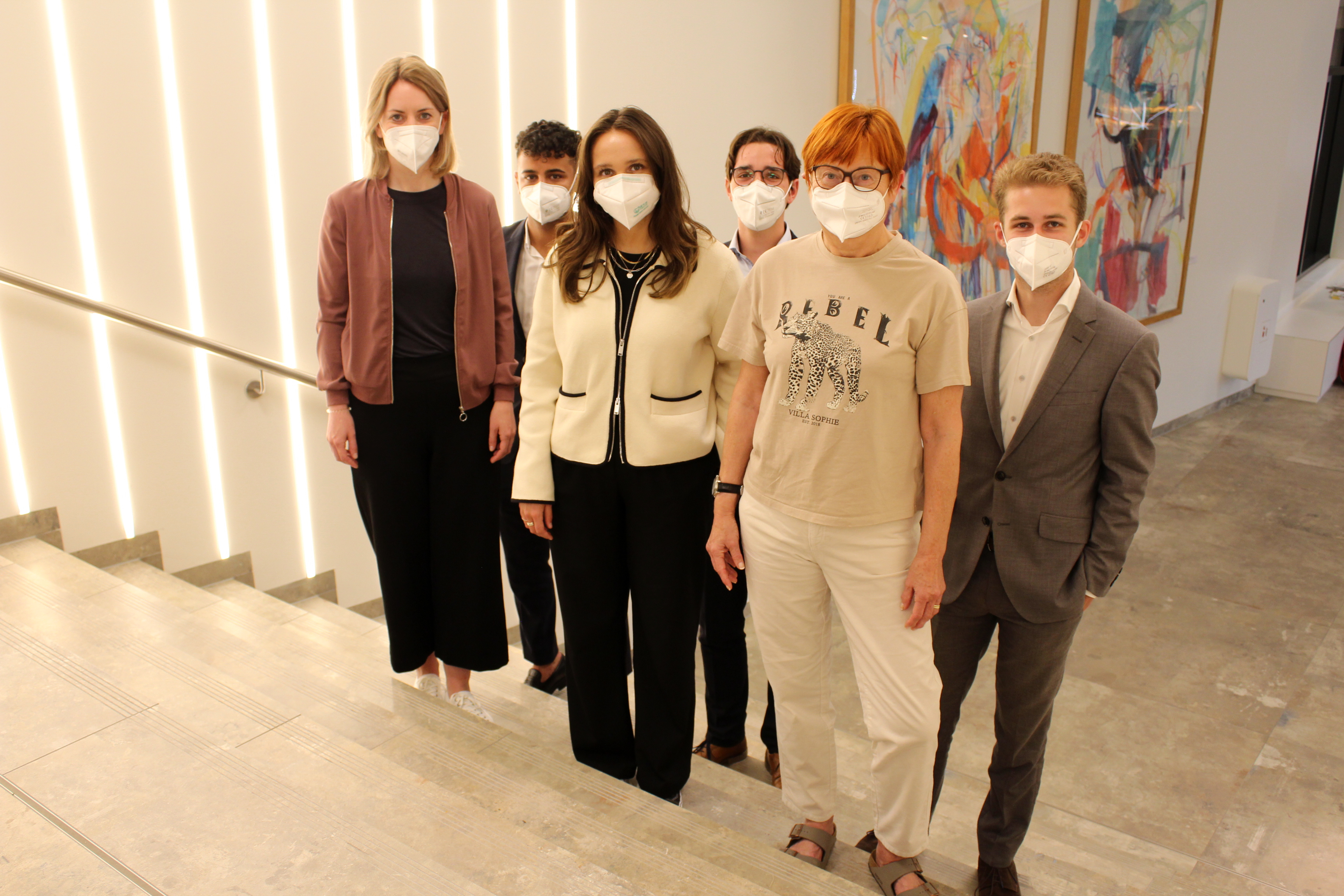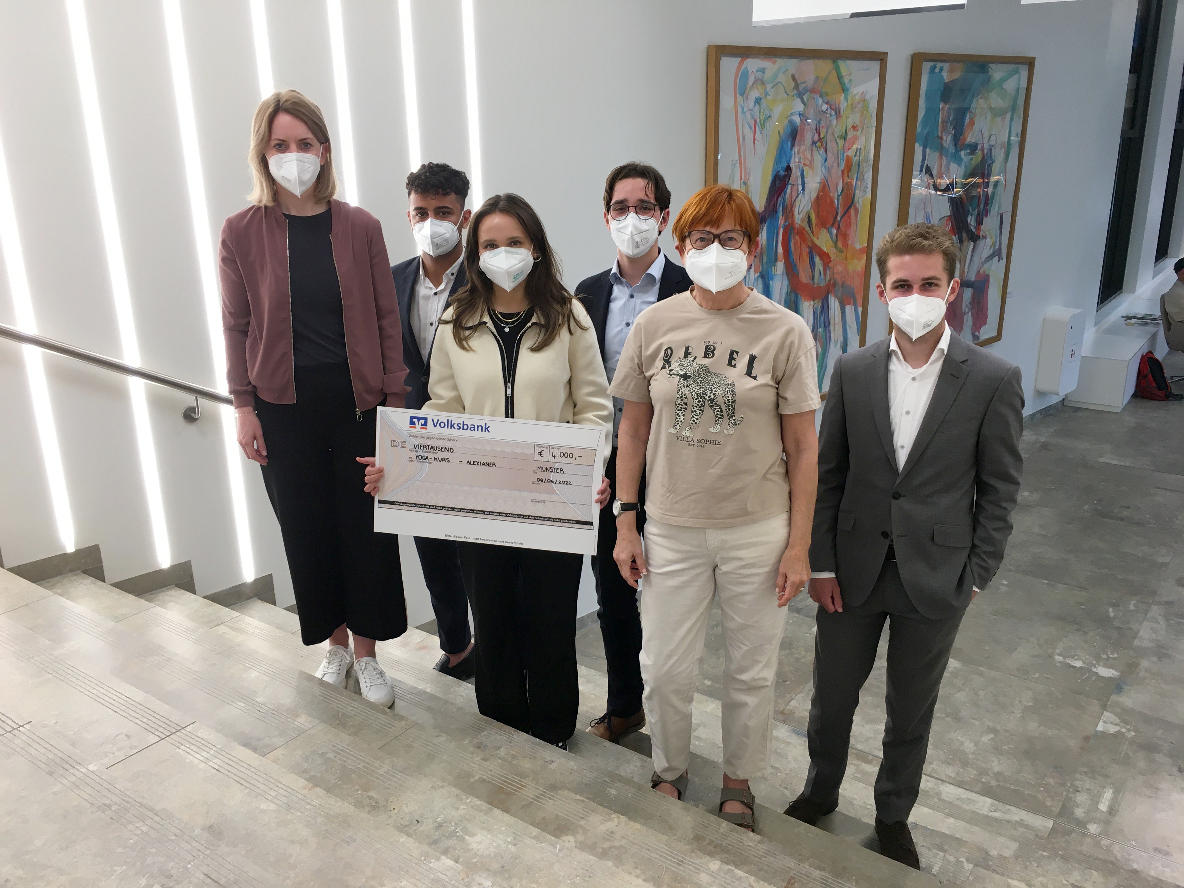 Das Bild zeigt (v.l.) Sabrina Schulz vom Fundraising des Clemenshospitals, Zidane Atalan, Lia Dörries und Lukas Finke, Auszubildende der Volksbank, Dr. Renate Kleine-Zander, Leiterin der Yoga-Kurse für Patientinnen mit Krebs im Clemenshospital, sowie Justus Bettler, Auszubildender der Volksbank.