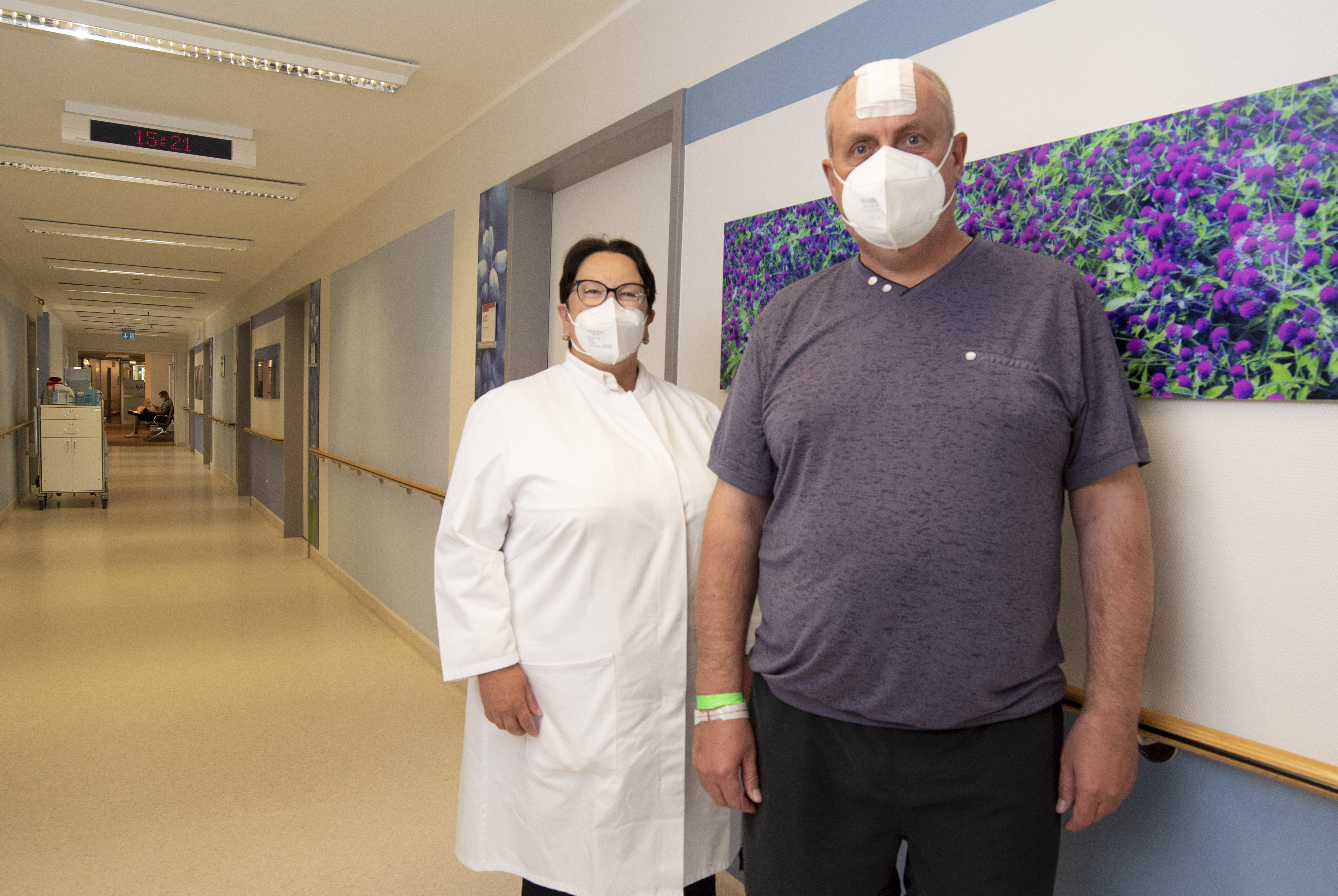 CLE_Hirntumor: Vasyl Sushko (r.) kann dank der Operation durch Prof. Dr. Uta Schick (l.) wieder ohne Probleme stehen und gehen. Auch sein Sehvermögen und das Kurzzeitgedächtnis sind zurückgekehrt.