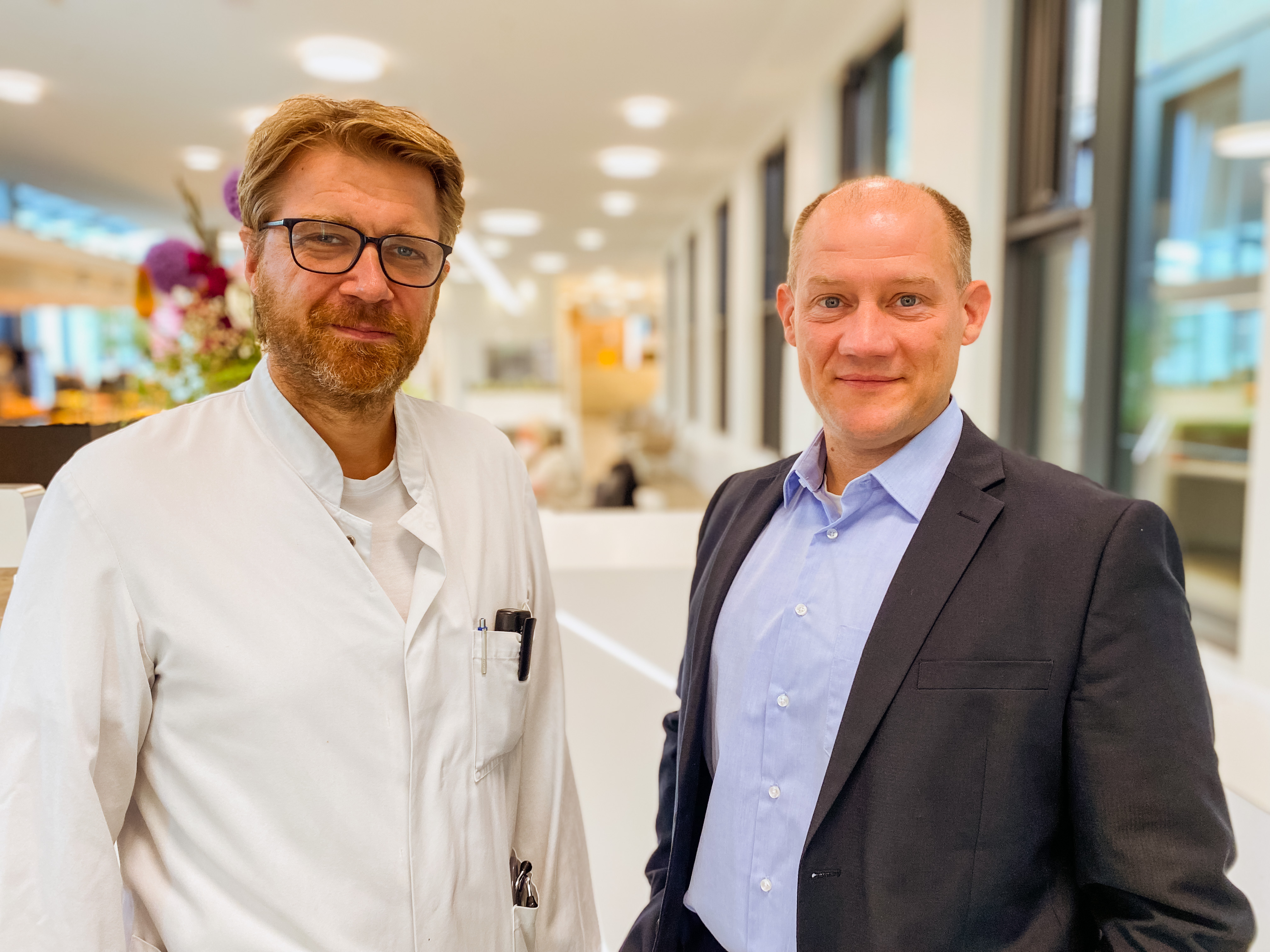 Bild 2: Priv.-Doz. Dr. Rüdiger Liersch (l.) ist nun Chefarzt der Inneren Medizin im Clemenshospital, im neuen Amt begrüßt wurde er von Geschäftsführer Maik Büscher.