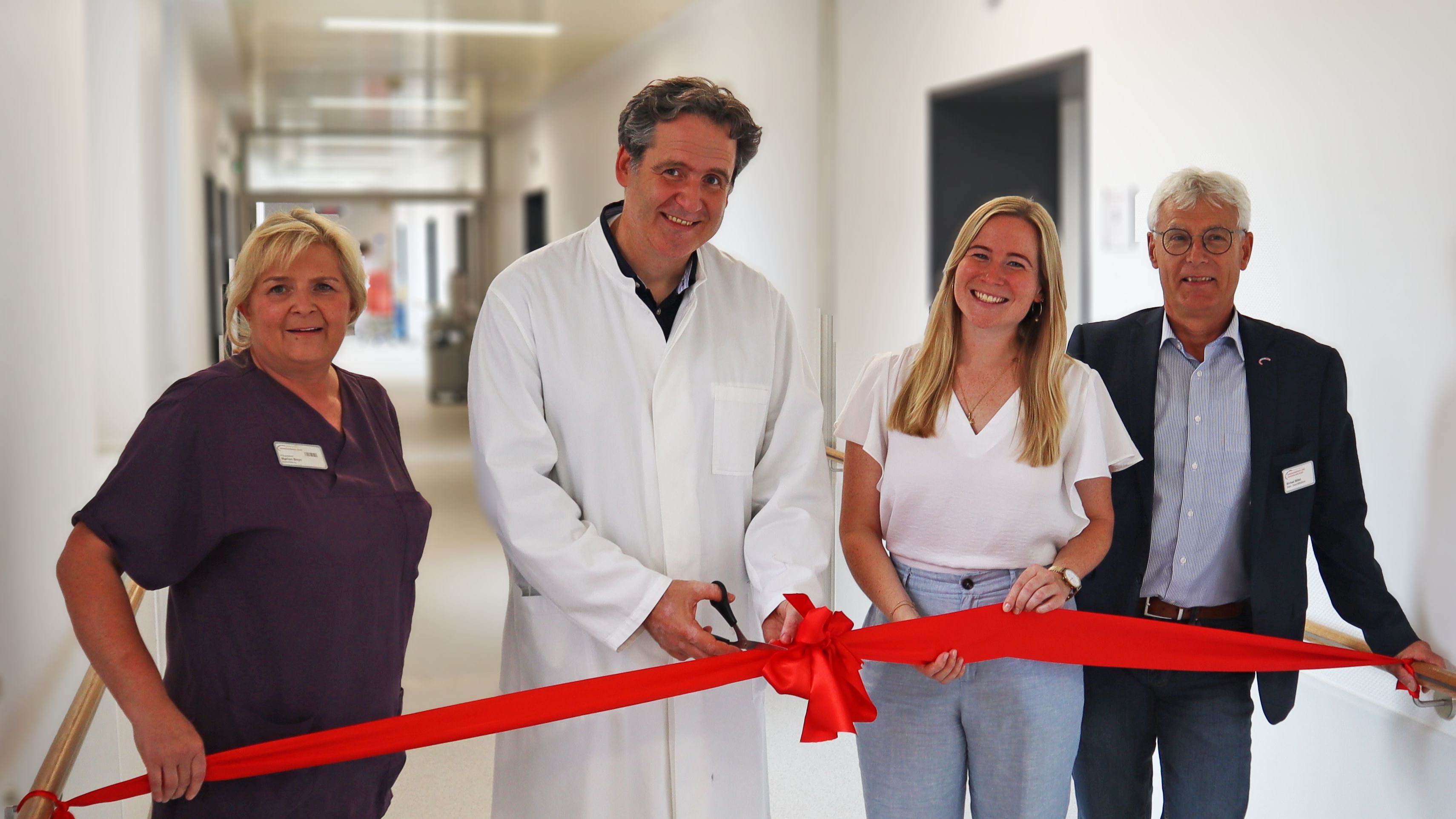 Foto (v.l.n.r.): Freuen sich über die Eröffnung der frisch sanierten Station der Allgemein- und Viszeralchirurgie im Bergmannsheil Buer: Marion Boyn (Stationsleitung), Chefarzt Privat-Dozent Dr. Markus Utech, Lisette Baal (Pflegebereichsleitung) und Michael Milfeit (Stellv. Geschäftsführer).