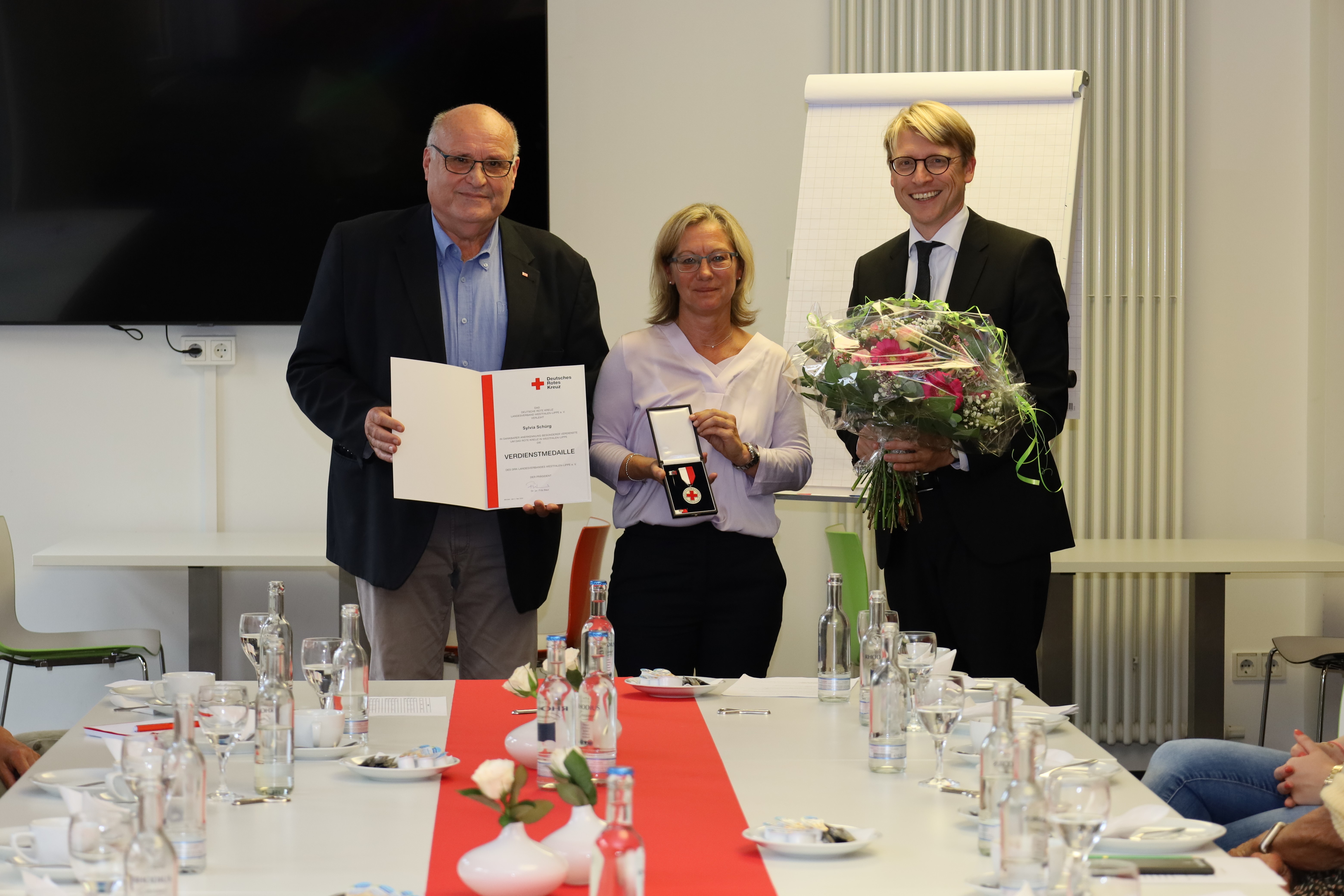 Auf dem Programm stand unter anderem die Verleihung der Verdienstmedaille an die Vorsitzende des DRK-Frauenvereins Siegen, Sylvia Schürg, durch Heinz-Wilhelm Upphoff (Vizepräsident des DRK-Landesverbandes Westfalen-Lippe) und Dr. Martin Horchler (hauptamtlicher Vorstand des DRK-Kreisverbandes). Seit dem 21. März 2012 Mitglied, wurde Sylvia Schürg direkt zur Vereinsvorsitzenden gewählt. „Du warst von Anfang an eine überzeugte Rotkreuzlerin und als solche in der Lage, andere ebenfalls für die Unterstützung der Rotkreuzaufgaben zu begeistern“, betonte Upphoff in seiner Rede. „Immer wieder schaffst Du es, die Mitglieder des DRK-Frauenvereins Siegen zu motivieren und neue dazuzugewinnen.“ Sie habe den Verein weiterentwickelt und an die heutigen Gegebenheiten angepasst.