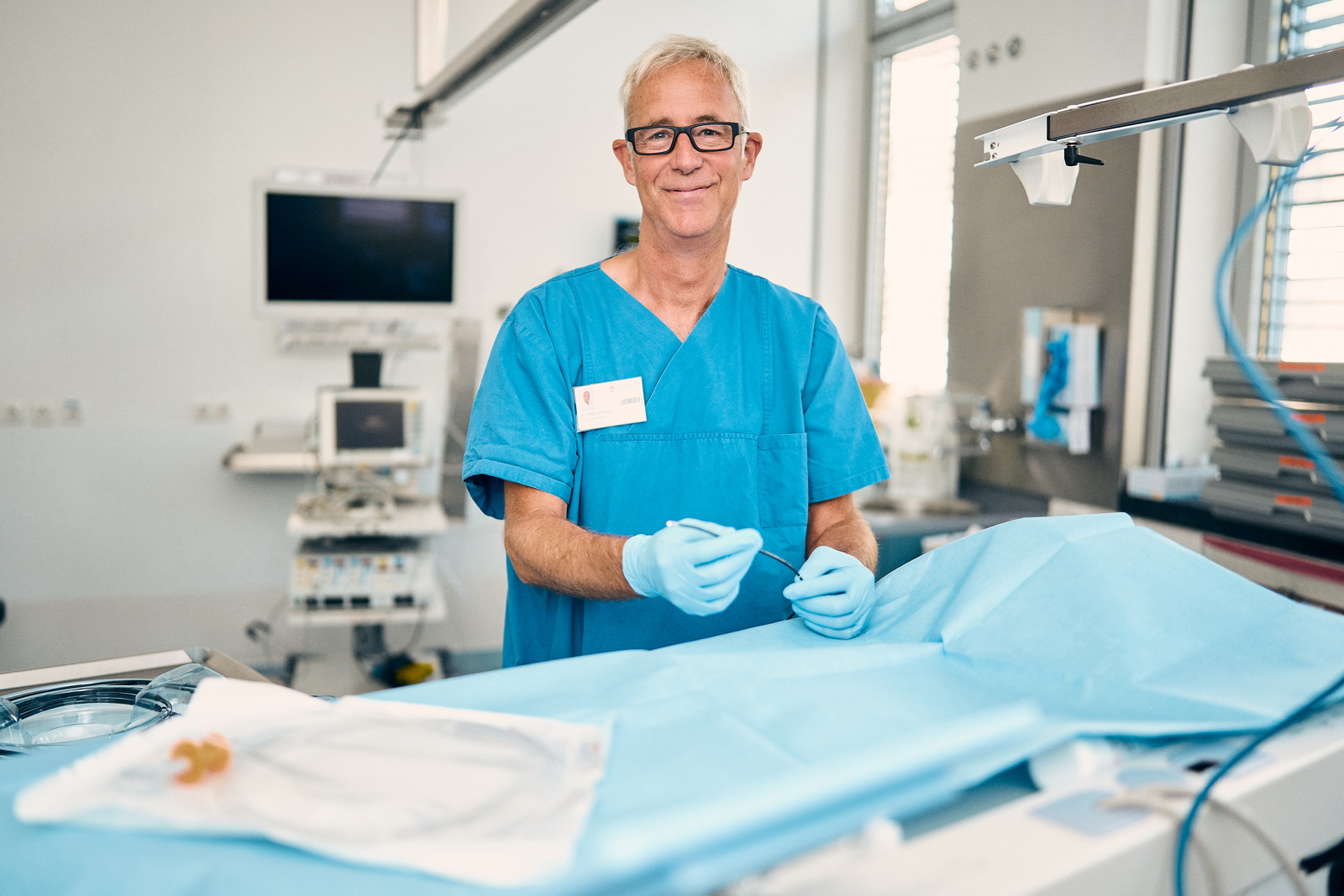 Foto 1 (© St. Marien-Hospital): Dr. med. Thomas Heyer, Chefarzt der Abteilung für Innere Medizin im St. Marien-Hospital Düren, mit dem Cholangioskopie-System im Behandlungsraum.