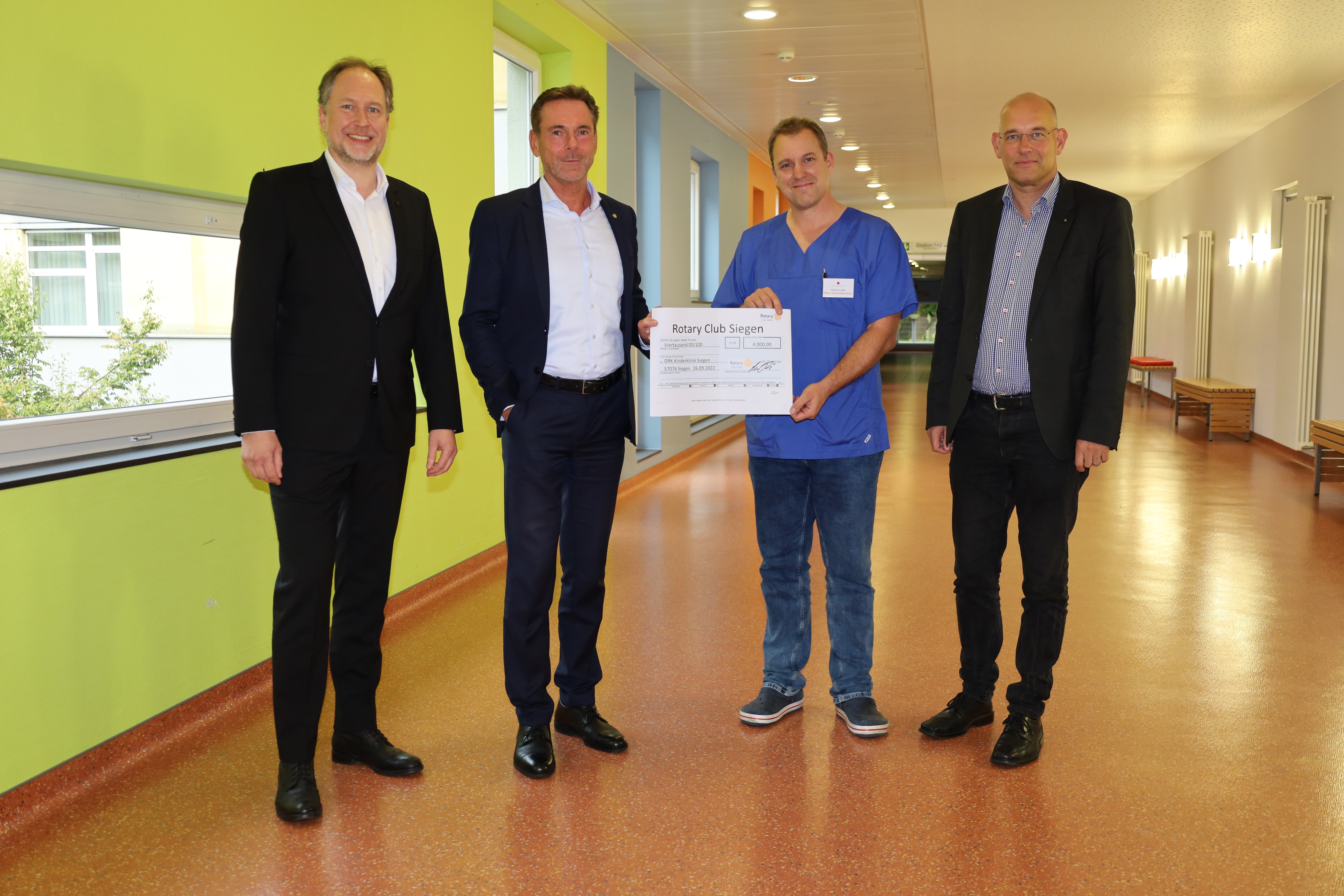 Siegen. 4.000,00 Euro hat der Rotary Club Siegen an das Kinderpalliativteam Siegen (KiPS) der DRK Kinderklinik Siegen gespendet. Im nächsten Jahr soll noch einmal die gleiche Summe folgen. Das Geld wird für die Teamunterstützung sowie Fort- und Weiterbildungsmaßnahmen des hochspezialisierten Teams verwendet. Oberarzt Marcus Linke nahm den Scheck gemeinsam mit Klinik-Geschäftsführer Carsten Jochum von den beiden Rotariern Prof. Dr. Volker Stein und Axel Körver entgegen.
