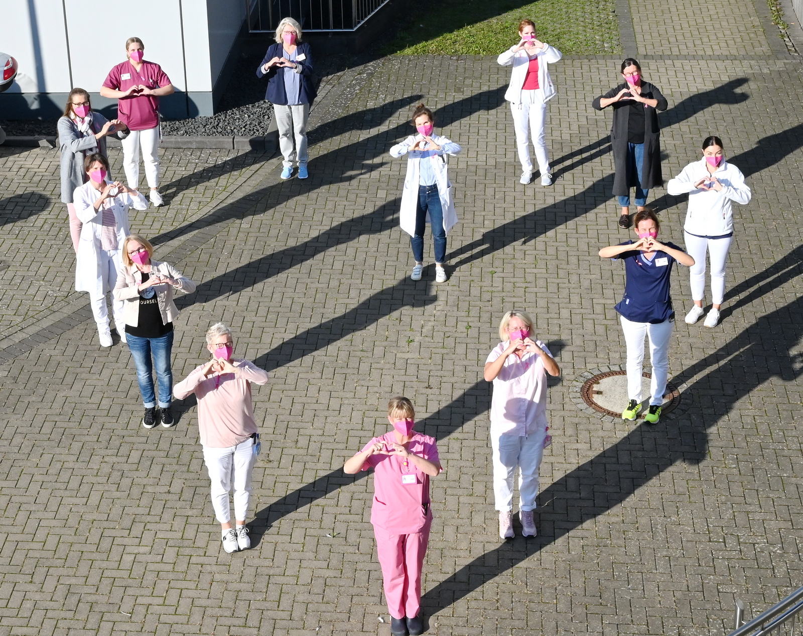 „Um ein Zeichen dafür zu setzen, wie wichtig eine umfassende Aufklärung, eine frühzeitige Diagnostik und eine interdisziplinäre Begleitung der Erkrankten sind, tragen wir im Oktober, dem offiziellen Brustkrebsmonat, auf Station sowie bei den Beratungs- und Untersuchungsterminen alle pinkfarbene Masken und Schleifen“, erklärt Oberärztin Dr. Anna Rüland, Sektionsleiterin des Brustzentrums in Düren-Birkesdorf, in dem alle Erkrankungen der weiblichen Brust nach neuesten wissenschaftlichen Erkenntnissen abgeklärt, diagnostiziert und therapiert werden. Durch die Kooperation mit den Brustzentren des St. Elisabeth-Krankenhauses in Köln-Hohenlind und der Evangelischen Kliniken Essen-Mitte können Brustkrebs-Patientinnen zeitnah auch modernste Studienkonzepte angeboten werden.