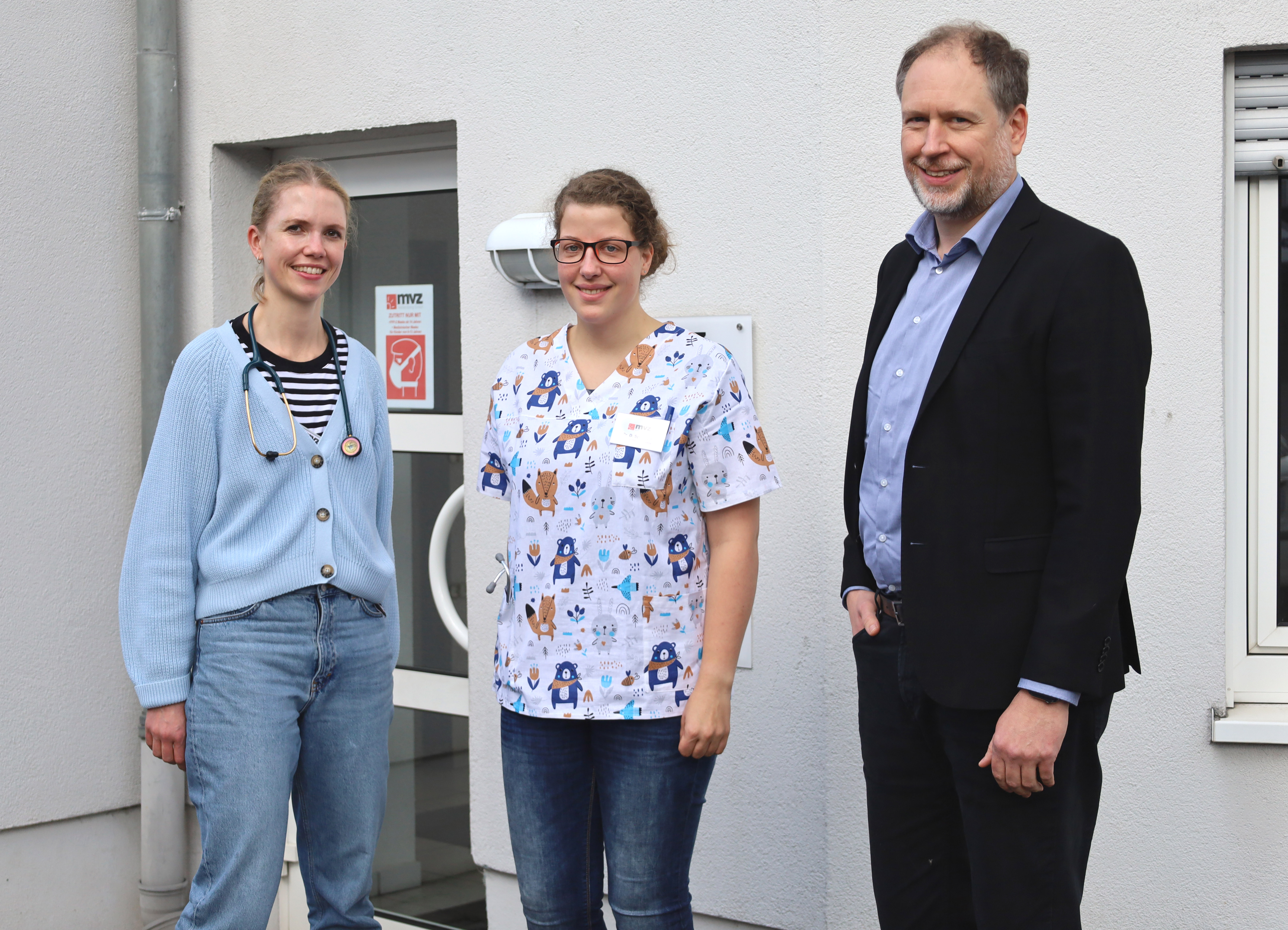 Foto: Frau Dr. Verena Sondermann-Claaßen (links), Frau Dr. Dinah Splitthoff (Mitte) und Carsten Jochum (GF DRK-Kinderklinik Siegen gGmbH und mvz Wellersberg GmbH, links) vor der Kinderarztpraxis in Geisweid