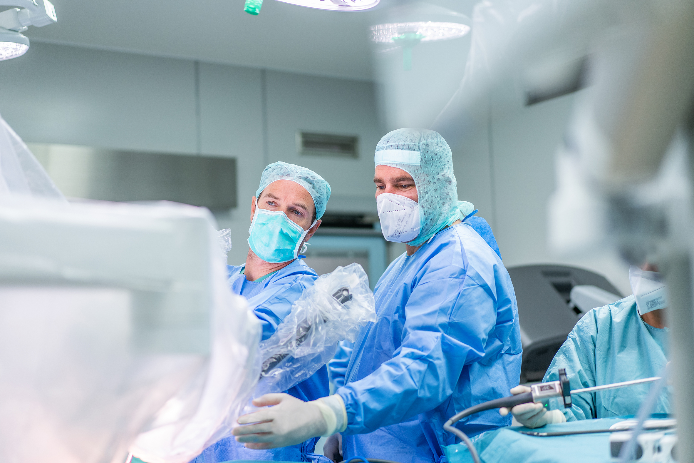Bild 2: Prof. Dr. Daniel Vallböhmer (rechts) mit Prof. Dr. Peter Grimminger (links) während des Eingriffs