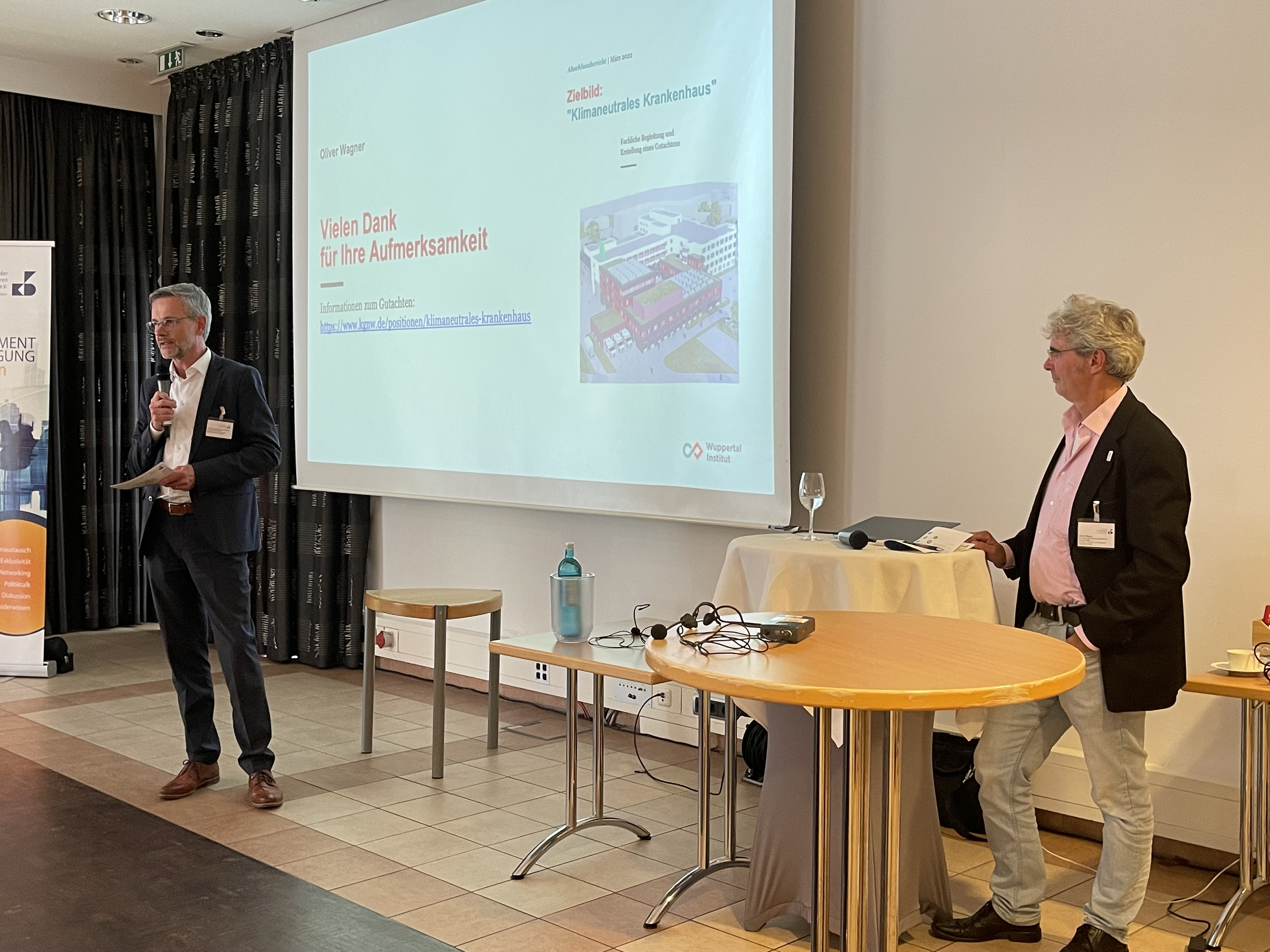 Nach einleitenden Worten von des Landesgruppen-Vorsitzenden Wolfgang Mueller, Geschäftsführer Vestische Caritas-Kliniken GmbH, eröffnete Oliver Wagner, Co-Leiter des Forschungsbereichs Energiepolitik Energie-, Verkehrs- und Klimapolitik am Wuppertal Institut mit dem Einführungsvortrag „Wege zur Klimaneutralität im Krankenhaus – Quick Win‘s zur Energieeinsparung“ das Symposium. Dabei legte er auch gleich zu Beginn den Finger in die Wunden, die viele Krankenhausmanager aktuell beschäftigen: Drastischer und historisch einmaliger Anstieg der Energieträgerpreise mit Blick auf Erdgas, Öl und Kohle, die reale und begründete Sorge hinsichtlich erwartbarer physischer Knappheiten und die Befürchtung vor sozialen Verwerfungen und Spannungen, die letztendlich die Kliniken unmittelbar betreffen. Sodann zeigte er mit Gebäudeenergie und Wärme- sowie Stromeffizienz mögliche Handlungsfelder auf, aus denen er dann, in Anlehnung an das jüngst publizierte Gutachten im Auftrag der nordrhein-westfälischen Krankenhausgesellschaft (KGNW), zehn Maßnahmen für Kliniken ableitete: Etablierung eines Klimaschutzmanagements, Ausbau der Photovoltaik, Nutzung von Wärme- und Kälteerzeugung, energetische Sanierung der Gebäudehüllen, Umstellung auf LED-Beleuchtung, Einsatz von Heizungspumpen, Weiterentwicklung der Lüftungsanlagen, Umstieg der Mobilität mit Blick auf Mitarbeitende, Ausbau der E-Mobilität und Einsatz klimafreundlicher Narkosegase.