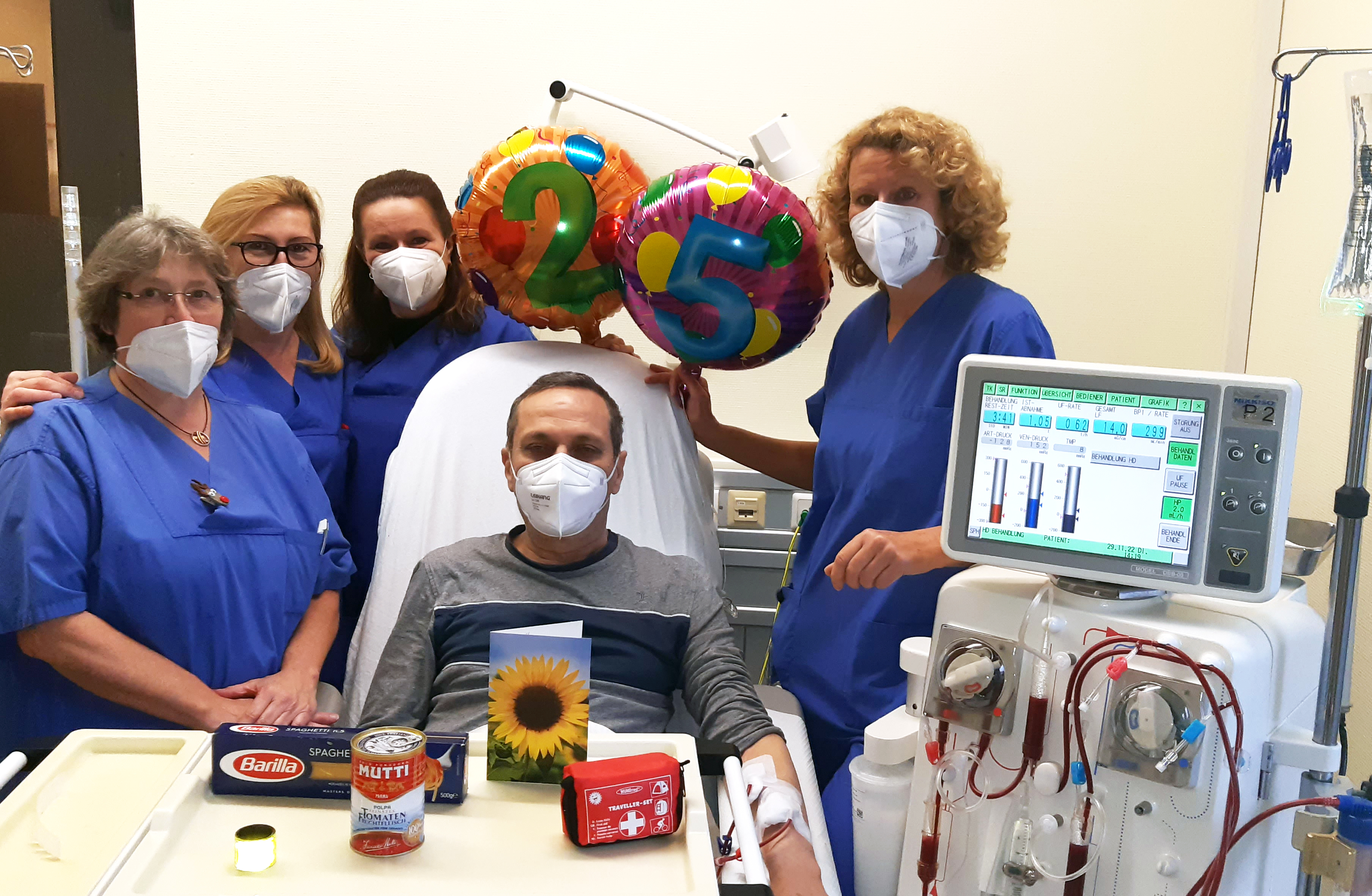 „Das Knappschaftskrankenhaus ist beinahe ein zweites Zuhause für mich. Seit 25 Jahren komme ich hierher und ich habe mich immer wohlgefühlt. Einige Pflegekräfte kenne ich von Anfang an. Sie sind den ganzen Weg mit mir zusammen gegangen“, erzählt Giuseppe Rapisade und freut sich über die Aufmerksamkeiten, die das Dialyseteam anlässlich seines besonderen Jubiläums für ihn vorbereitet hat. Am 29.11.2022 waren es genau 25 Jahre, die er regelmäßig zur Blutwäsche ins Dialysezentrum kommen musste.
