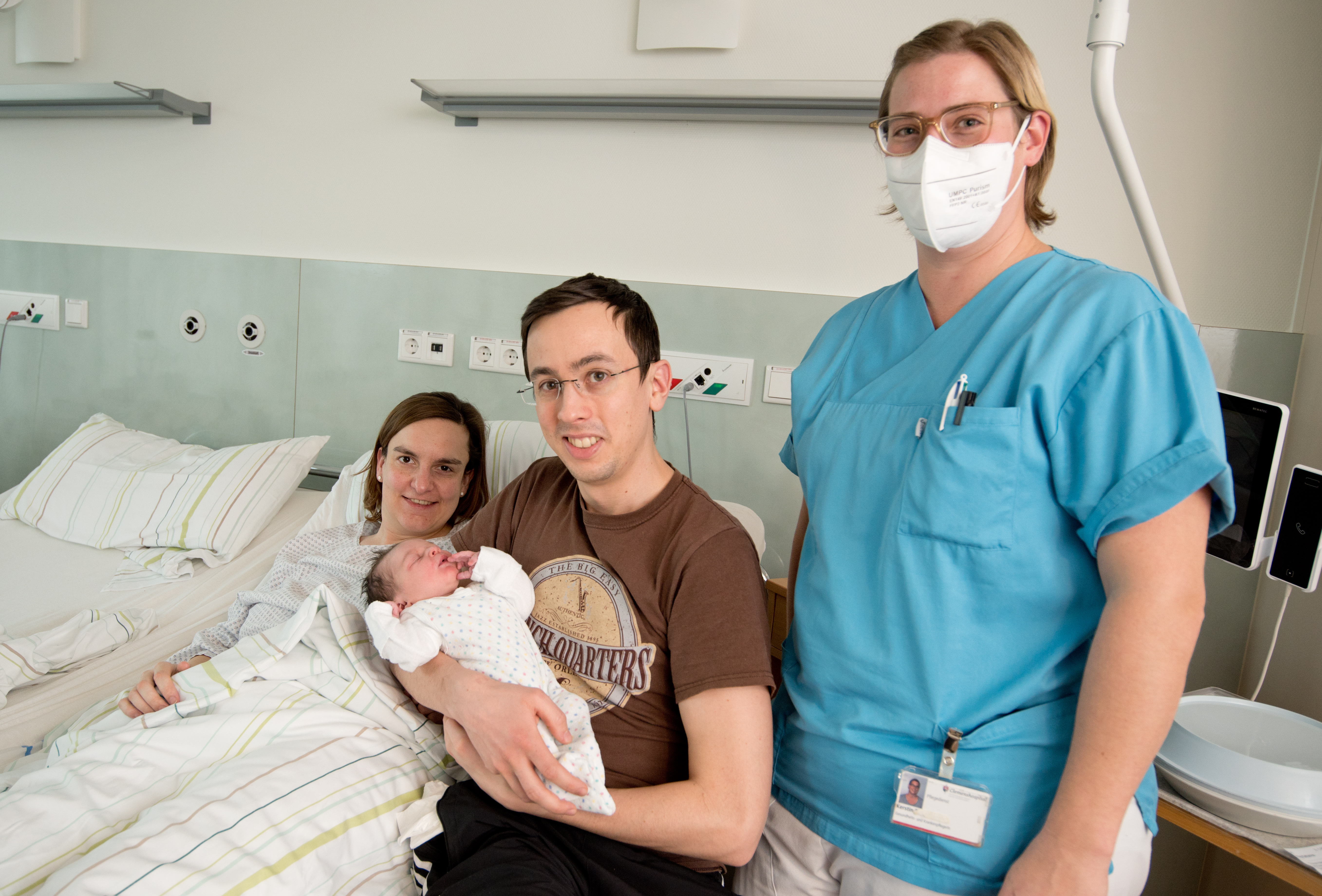 Bild: Katharina und Nicolai Herzog freuen sich mit ihrer Tochter Lea Frieda über die glückliche Geburt. Die Gesundheits- und Krankenpflegerin Kerstin Eickenbusch sorgt mit ihrem Team dafür, dass es den Dreien gut geht.