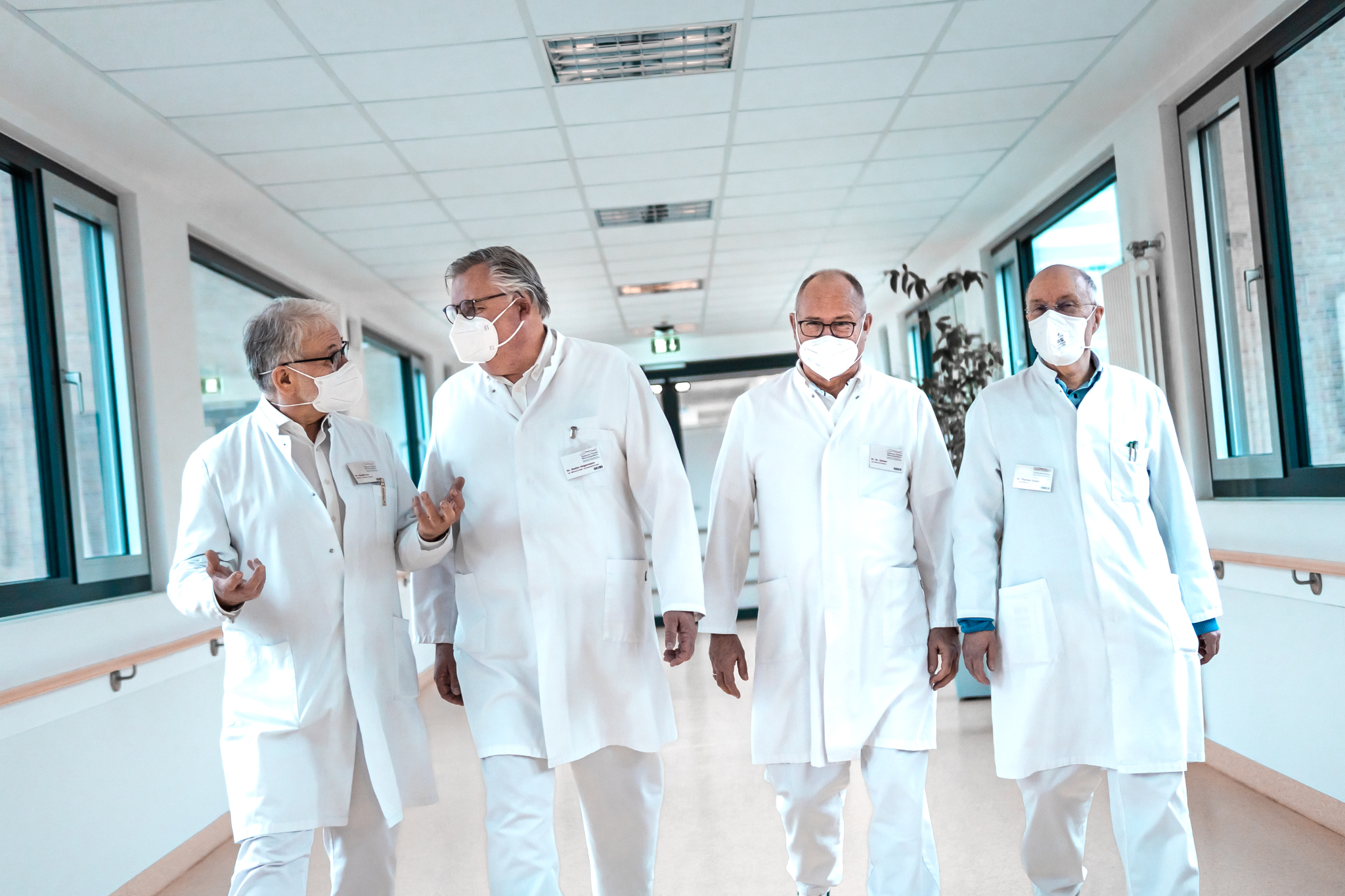 Bild 1 (v. l. n. r.): Dr. Harald Löw, Ärztlicher Direktor und Chefarzt der Unfall- und Gelenkchirurgie, Dr. Stefan Hegermann, Leitender Oberarzt in der Klinik für Unfall- und Gelenkchirurgie, Dr. Dr. Manfred Gatzen, Leitender Oberarzt des Zentrums für Geriatrie, und Dr. Thomas Jaeger, Chefarzt des Zentrums für Geriatrie, im Durchgang zwischen Geriatrie und Haupthaus.