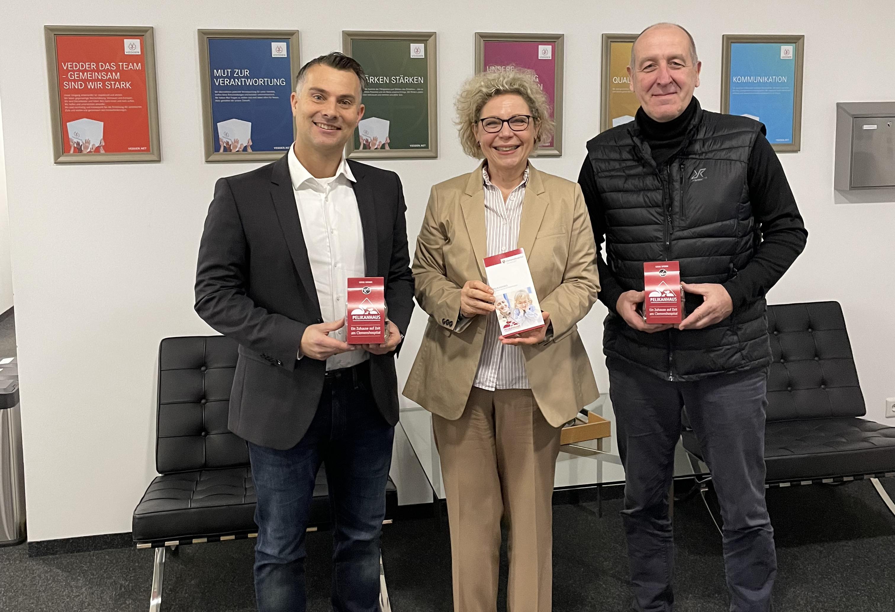 Münster. Über eine Spende in Höhe von 2.200 Euro für das Projekt „Pelikanhaus“ können sich die Verantwortlichen des Clemenshospitals freuen. Übergeben wurde sie von Marc Koch, Geschäftsführer der Firma Vedder in Lüdinghausen. Die Summe setzt sich zusammen aus einem Teil des Erlöses einer Auktion und einer Verlosung, die während der Weihnachtsfeier der Firma veranstaltet wurden sowie den Einnahmen eines Sommerfestes. Aufgerundet wurde die Summe durch 500 Euro, die die Geschäftsleitung beigesteuert hat. „Wir wollten das Geld für einen guten Zweck einsetzen. Das Pelikanhaus wird den Angehörigen schwer kranker Kinder, die im Clemenshospital behandelt werden, ein gemütliches Zuhause auf Zeit bieten. Diesen Gedanken finden wir großartig!“, wie Koch betont. Entgegengenommen wurde die Spende von Dr. Martina Klein, Leiterin des Fundraisings des Clemenshospitals, begleitet wurde sie von Bernd Eggenstein, dessen Kinder in der Klinik der Alexianer behandelt wurden und der über das geplante Bauprojekt berichtete. „Die Spendensumme wird vollständig dem ‚Pelikanhaus‘ und damit den Angehörigen unserer kleinsten Patientinnen und Patienten zugutekommen. Wir danken den Mitarbeiterinnen und Mitarbeitern der Firma Vedder ganz herzlich für ihr Engagement!“, wie Dr. Martina Klein während der Spendenübergabe sagte.