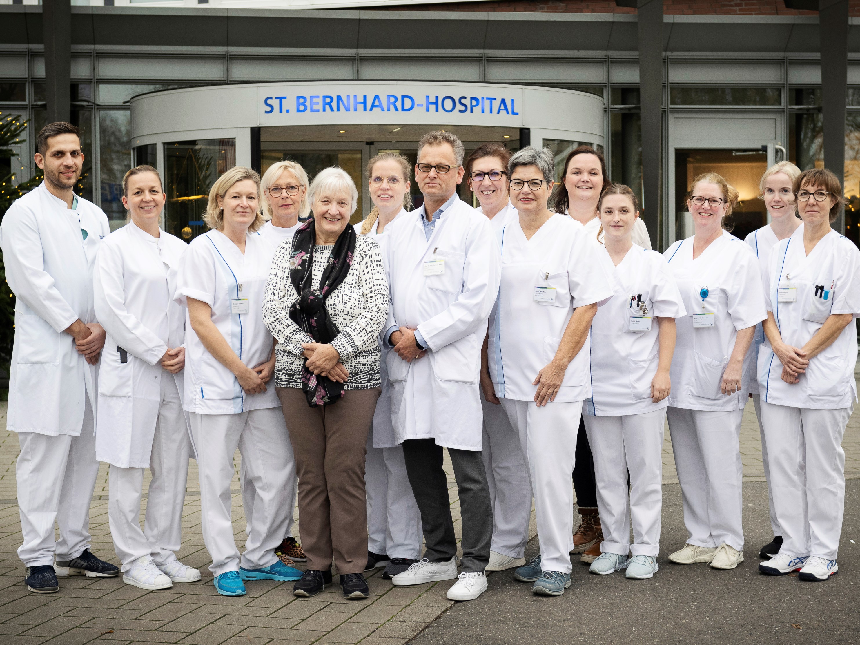 Bild: Patientin Inge Gutschek und Prof. Gernot M. Kaiser (Bildmitte) mit dem kompletten Beno-Team