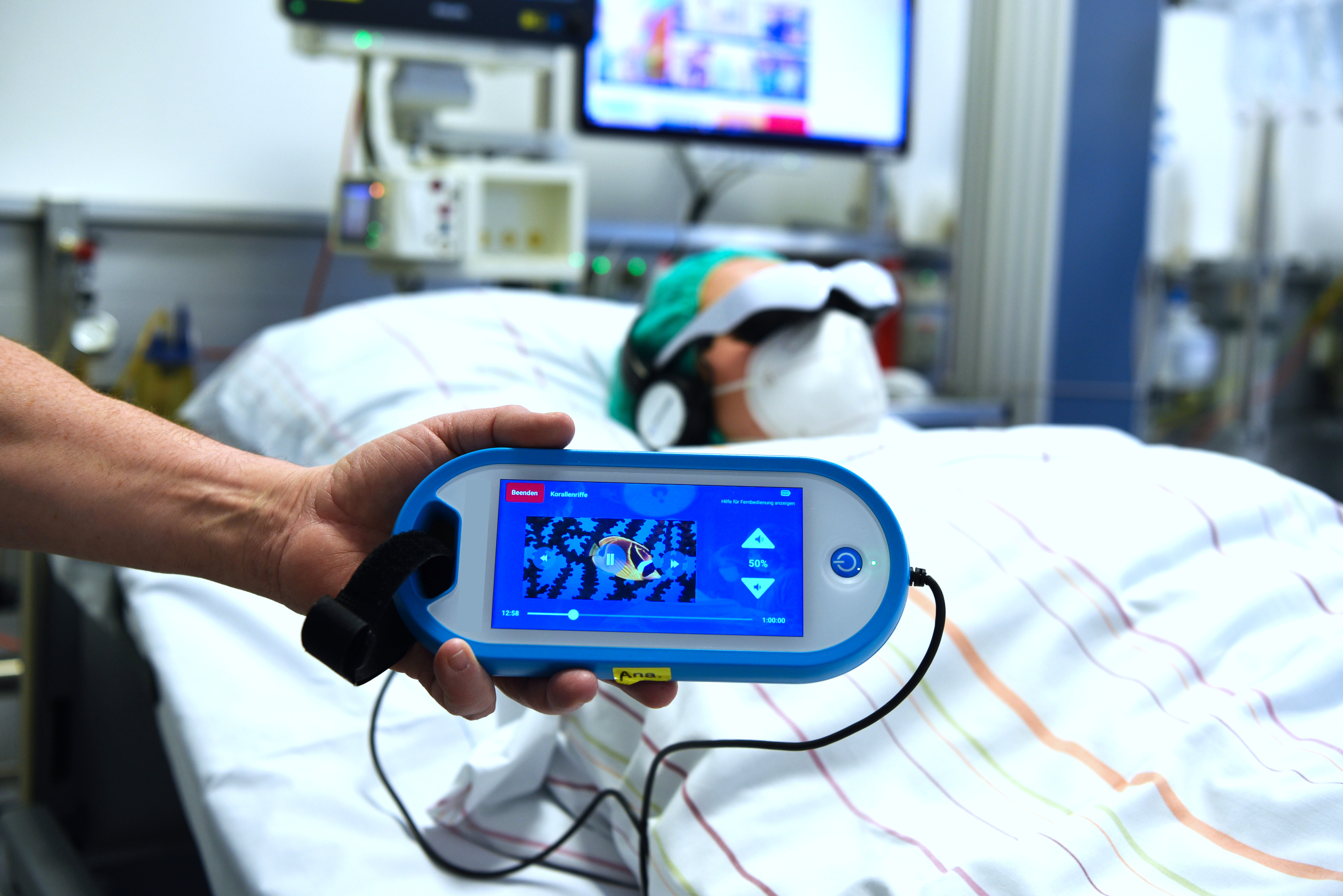 Thomas Greskötter widmet sich diesem Projekt seit vergangenem Jahr und hat die audiovisuellen Brillen im Klinikum eingeführt. Besonders bei operativen Eingriffen, bei denen die Patientinnen und Patienten nicht narkotisiert werden müssen, hilft die Videobrille beim Entspannen. Gleichzeitig haben die behandelnden Ärztinnen und Ärzte eine ruhiger liegende Person auf dem OP-Tisch und können sich ganz ihrer Arbeit widmen. „Die Idee an sich ist nicht neu“, sagt Greskötter. „Im Bergmannsheil gab es schon vor 30 Jahren Walkmans, um erkrankte Personen mit Musik bei einem Eingriff abzulenken. Aber mit der Videobrille sind jetzt auch die Augen der Patientinnen und Patienten einbezogen, was sehr gut ankommt.“ Das medizinische Personal kann mit Hilfe des verbundenen Touchscreens der Brille das Programm für die behandelte Person steuern und trotz der Kopfhörer mit dieser während des Eingriffs kommunizieren.