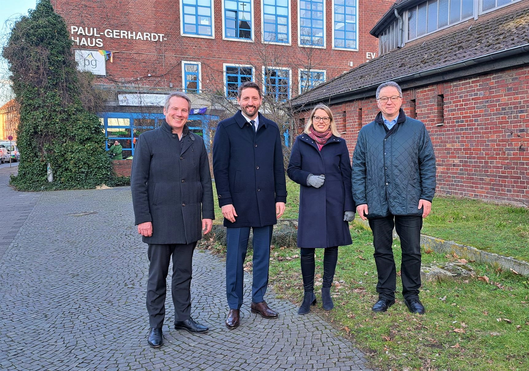 Die Projektpartner trafen sich vor Ort am künftigen Standort des Bildungs- und Begegnungs-Campus in Münster (v.l.): Dr. Nils Brüggemann (Vorstandsvorsitzender Franziskus Stiftung), Robin Denstorff (Stadtbaurat Stadt Münster), Annika Wolter (Regionalgeschäftsführerin Franziskus Stiftung für die Region Münster) und Frank Winkelmeyer (Pfarrer evangelische Erlöser-Kirchengemeinde).