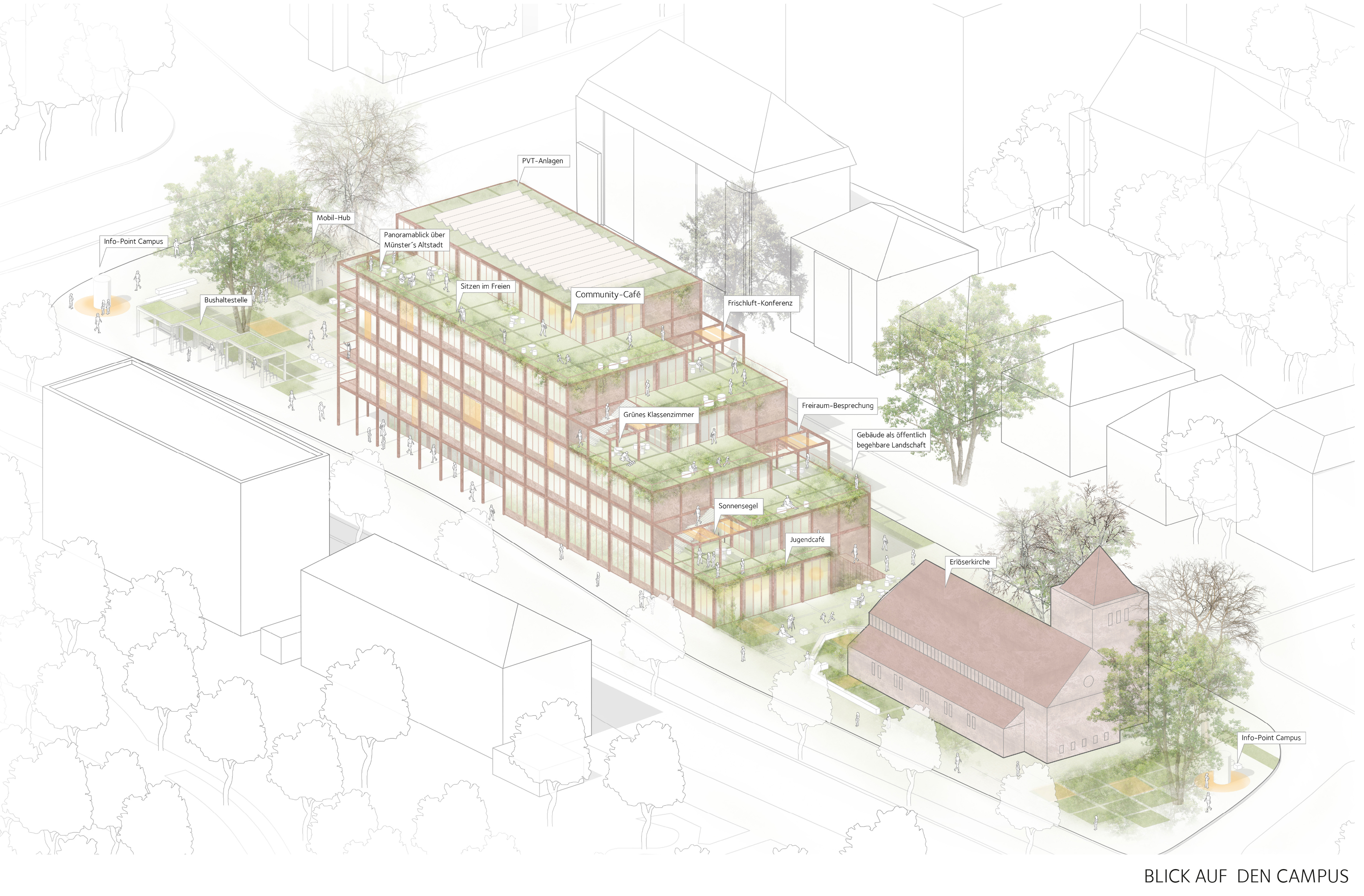 Die unterschiedlichen Nutzungszwecke als Gesundheitsakademie mit dem Schwerpunkt einer modernen Schule für Gesundheitsberufe für junge Menschen und einem Simulationszentrum sowie die Angebote der Kirchengemeinde bieten durch die ideellen und inhaltlichen Verknüpfungen große Chancen. Sowohl die St. Franziskus-Stiftung Münster als auch die evangelische Kirchengemeinde legen großen Wert auf eine ökologisch sinnvolle und damit nachhaltige Entwicklung ihrer Einrichtungen. Der Architektenentwurf sieht ein sechsstöckiges Gebäude vor, das passend zu den Bestandsgebäuden der Erlösergemeinde aus rotem Backstein bestehen wird und sich städtebaulich bestmöglich ins Gesamtgefüge integriert. Der Bildungs- und Begegnungscampus wird zur Seite der Kirche stufenförmig errichtet – der jeweilige Vorsprung wird auf jeder Etage als begehbare Grünterrasse angelegt.