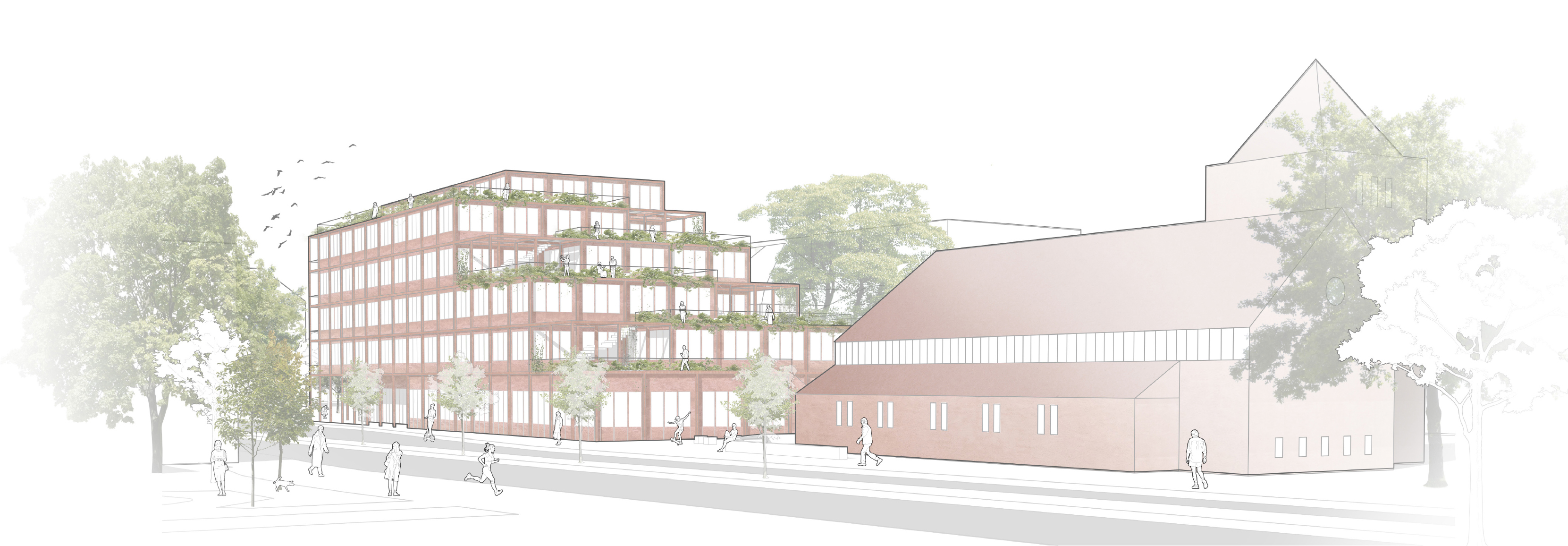 Der Siegerentwurf des Architektenbüros „puppendahl architekten gmbh“ sieht ein sechsstöckiges Gebäude vor, das passend zur Erlösergemeinde aus rotem Backstein bestehen wird und sich städtebaulich bestmöglich integriert. Der Bildungs- und Begegnungscampus wird zur Seite der Kirche stufenförmig errichtet – der jeweilige Vorsprung wird auf jeder Etage als begehbare Grünterrasse angelegt.