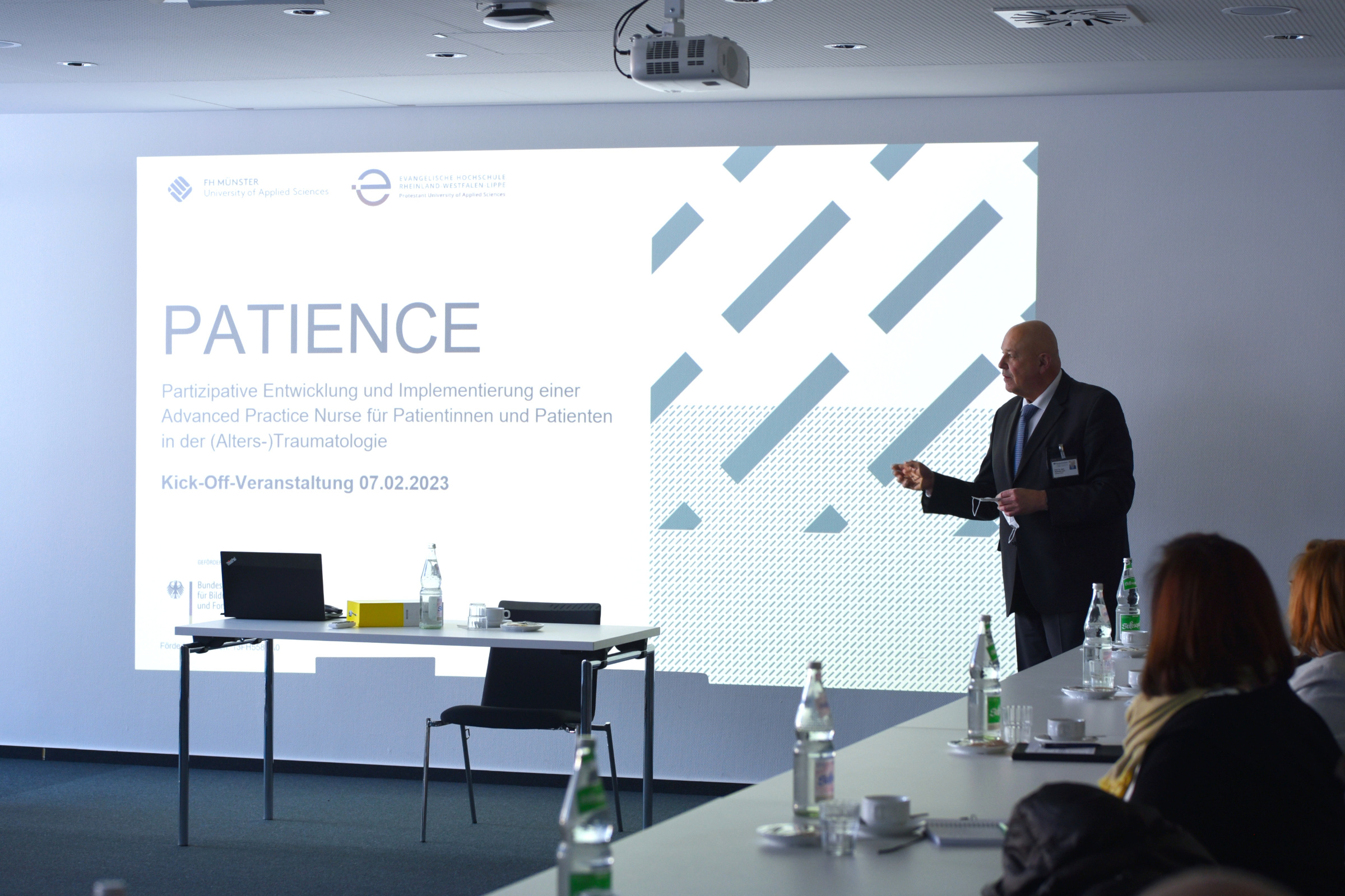 Bochum. Im BG Universitätsklinikum Bergmannsheil in Bochum fand am 07.02.2023 die Auftaktveranstaltung zum Forschungs- und Entwicklungsprojekt „Partizipative Entwicklung und Implementierung einer Advanced Practice Nurse für Patientinnen und Patienten in der (Alters-)Traumatologie - PATIENCE“ statt. Das vom Bundesministerium für Bildung und Forschung finanziell geförderte Vorhaben hat bereits am 01.10.2022 begonnen und wird über vier Jahre partnerschaftlich von den Kliniken der gesetzlichen Unfallversicherung (BG Kliniken), der FH Münster (Verbundkoordination) und der Evangelischen Hochschule RWL Bochum durchgeführt.