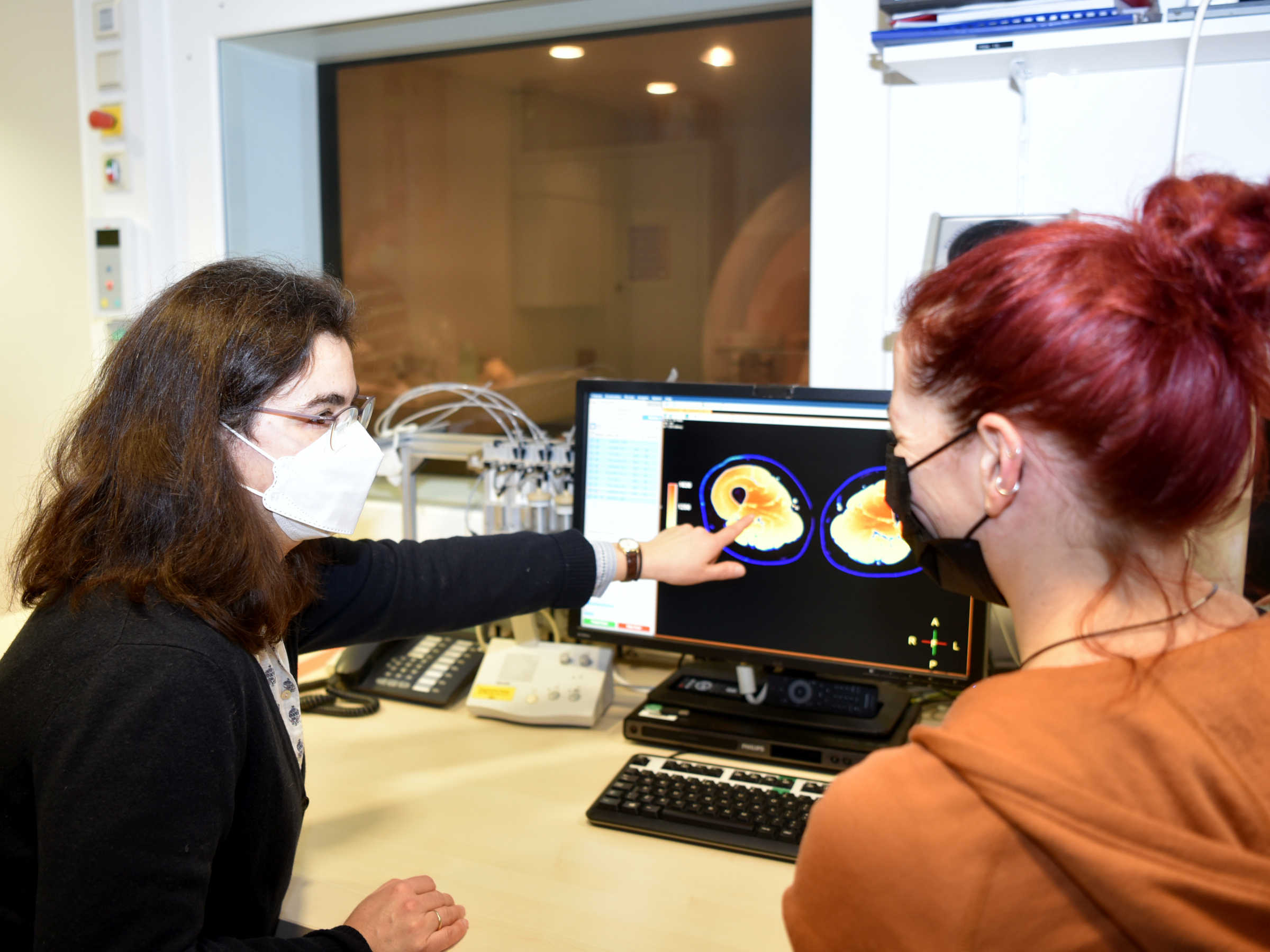 Bild 2: Jun.-Prof. Dr. Elena Enax-Krumova (li.) und PD Dr. Lara Schlaffke bei der Bildanalyse. Bildnachweis: BG Universitätsklinikum Bergmannsheil