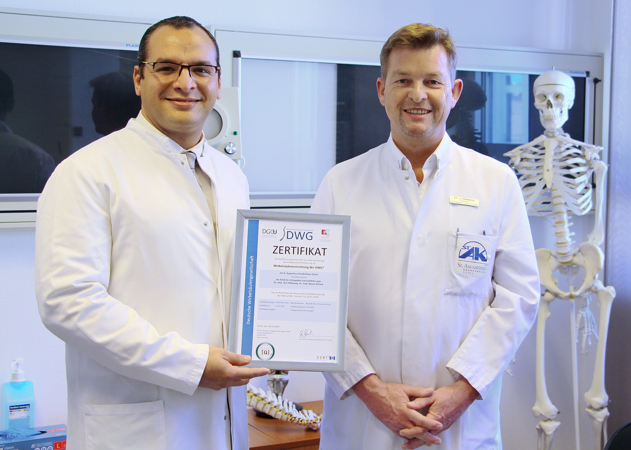 Düren. „Mit der Anerkennung als Wirbelsäuleneinrichtung der Deutschen Wirbelsäulengesellschaft (DWG) verfügen wir jetzt bereits über die dritte Zertifizierung der Klinik für Orthopädie und Unfallschirurgie im St. Augustinus-Krankenhaus“, freuen sich Dr. med. Jörn Hillekamp und Dr. med. Hazem Ahmed, MD. Neben dem Endoprothetikzentrum der Maximalversorgung und dem Traumazentrum ist nun die Sektion der Wirbelsäulenchirurgie im St. Augustinus-Krankenhaus durch die bedeutendste europäische Fachgesellschaft zertifiziert.