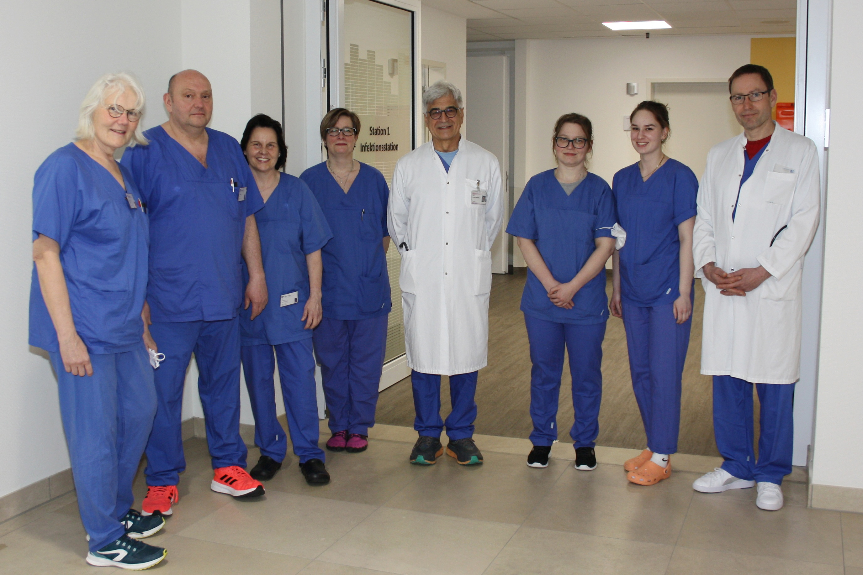 Tuberkulose-Patienten werden in der DGD Lungenklinik Hemer vom Team der Infektionsstation (Station1) versorgt; v.li. Elisabeth Junge (Pflegefachkraft), Michael Velte (Pflegefachkraft), Susanne Sommerfeldt (Stationsleitung, Pflegefachkraft), Anke Völker (Pflegefachkraft), Dr. med. Franz Stanzel (Chefarzt der Pneumologie), Sarah Eßmajor (Pflegefachkraft), Lina Borsberg (Pflegefachkraft), Dr. med. Ulrich Klein (Oberarzt Pneumologie) (Foto: Anja Haak DGD Lungenklinik Hemer)