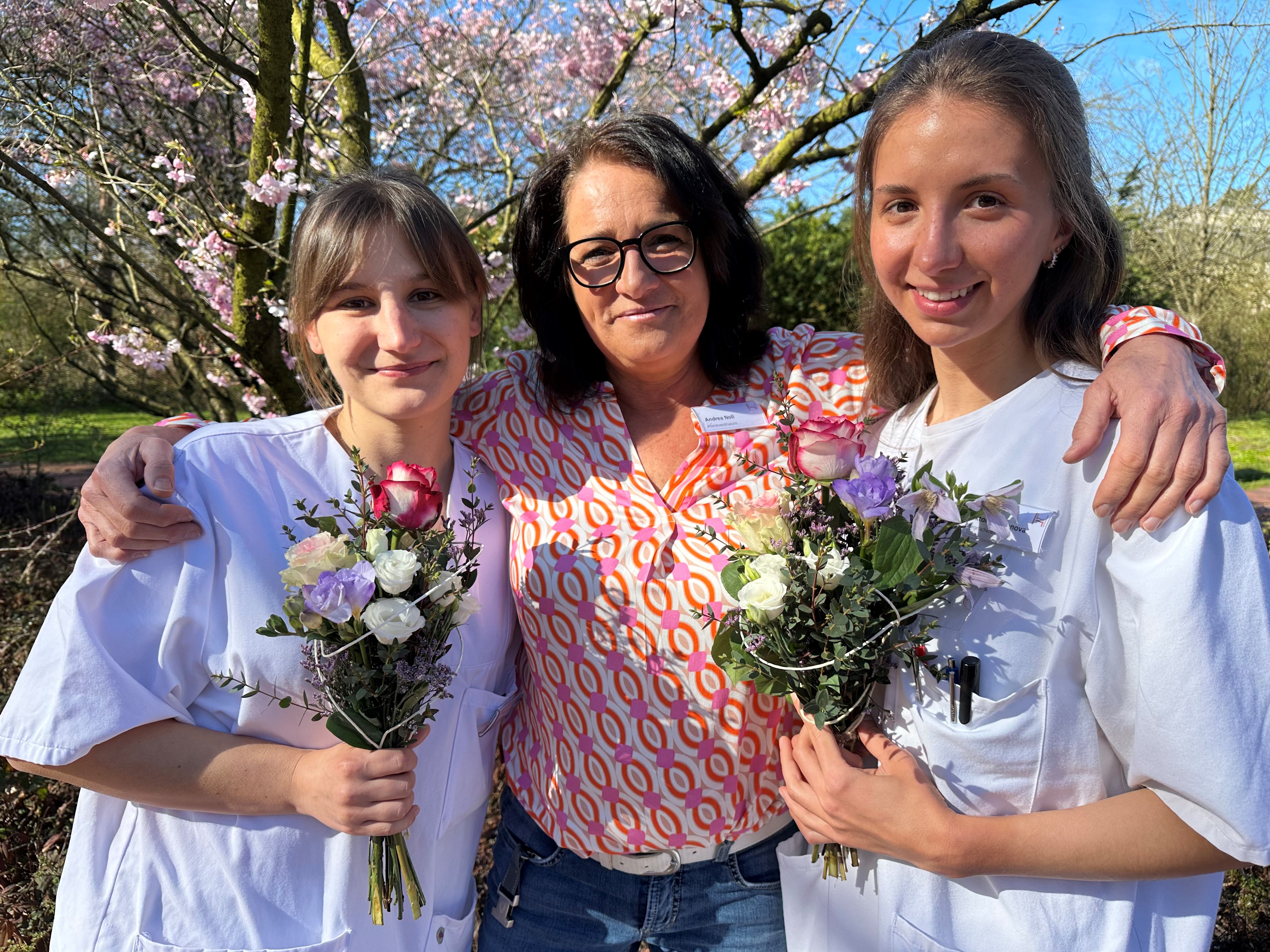 Foto: Frisch examiniert und stolz: Anna Furmann (v.l.) und Victoria Pimonova feiern ihr Examen als Pflegefachkraft mit der Praxiskoordinatorin der Fachklinik Hornheide, Andrea Noll. Laura Hülsken war bei der internen Gratulation leider erkrankt.