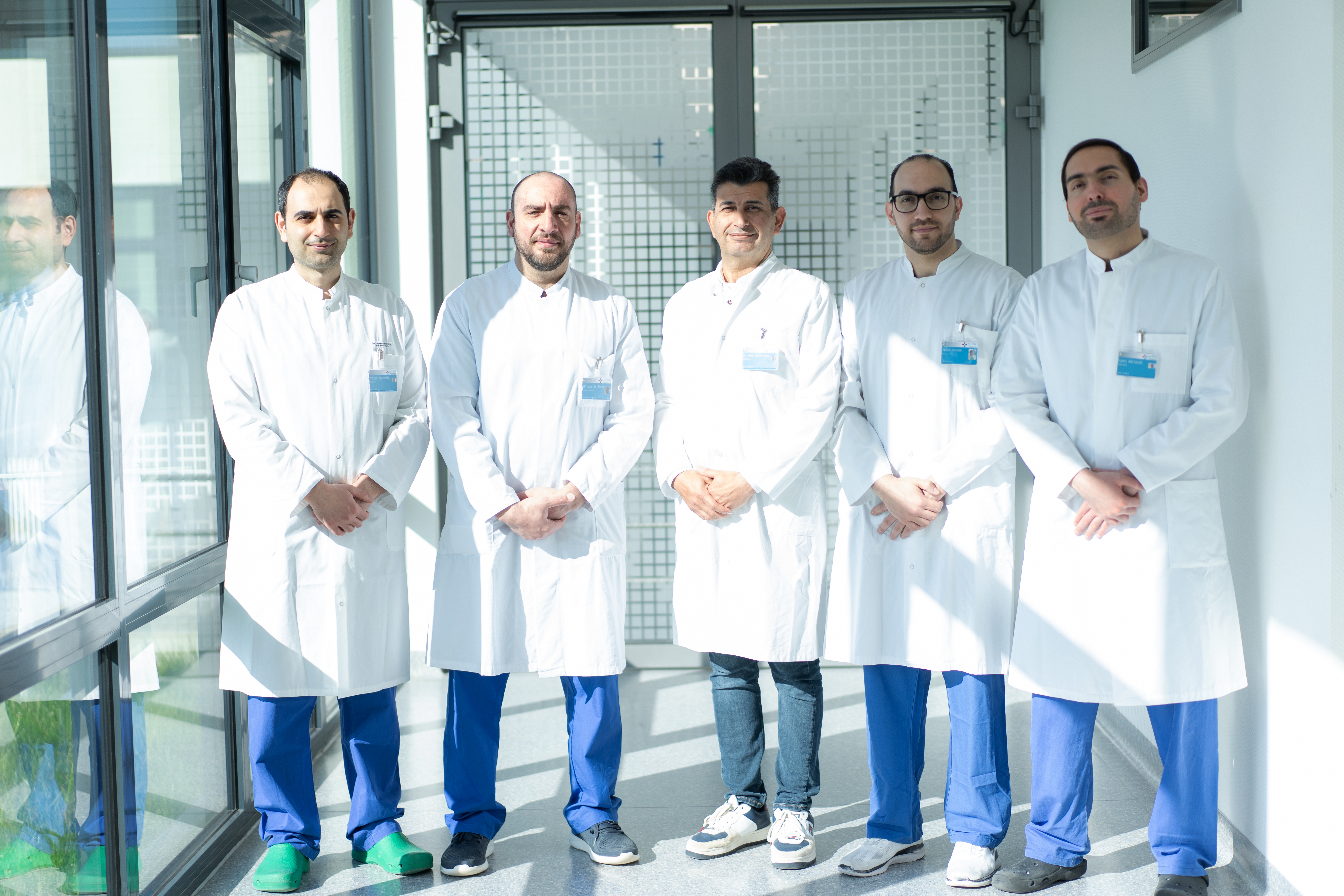 BU: Der neue Chefarzt und die Oberärzte der Klinik für Allgemeine Innere Medizin und Gastroenterologie. (v.l.n.r.) Wissam Darwiche (Oberarzt), Dr. univ. Mohammed Hirsh (Leitender Oberarzt), Dr. Samer Said (Chefarzt), Mohab Alshobaki (Oberarzt), Fares Alrmiesh (Oberarzt).