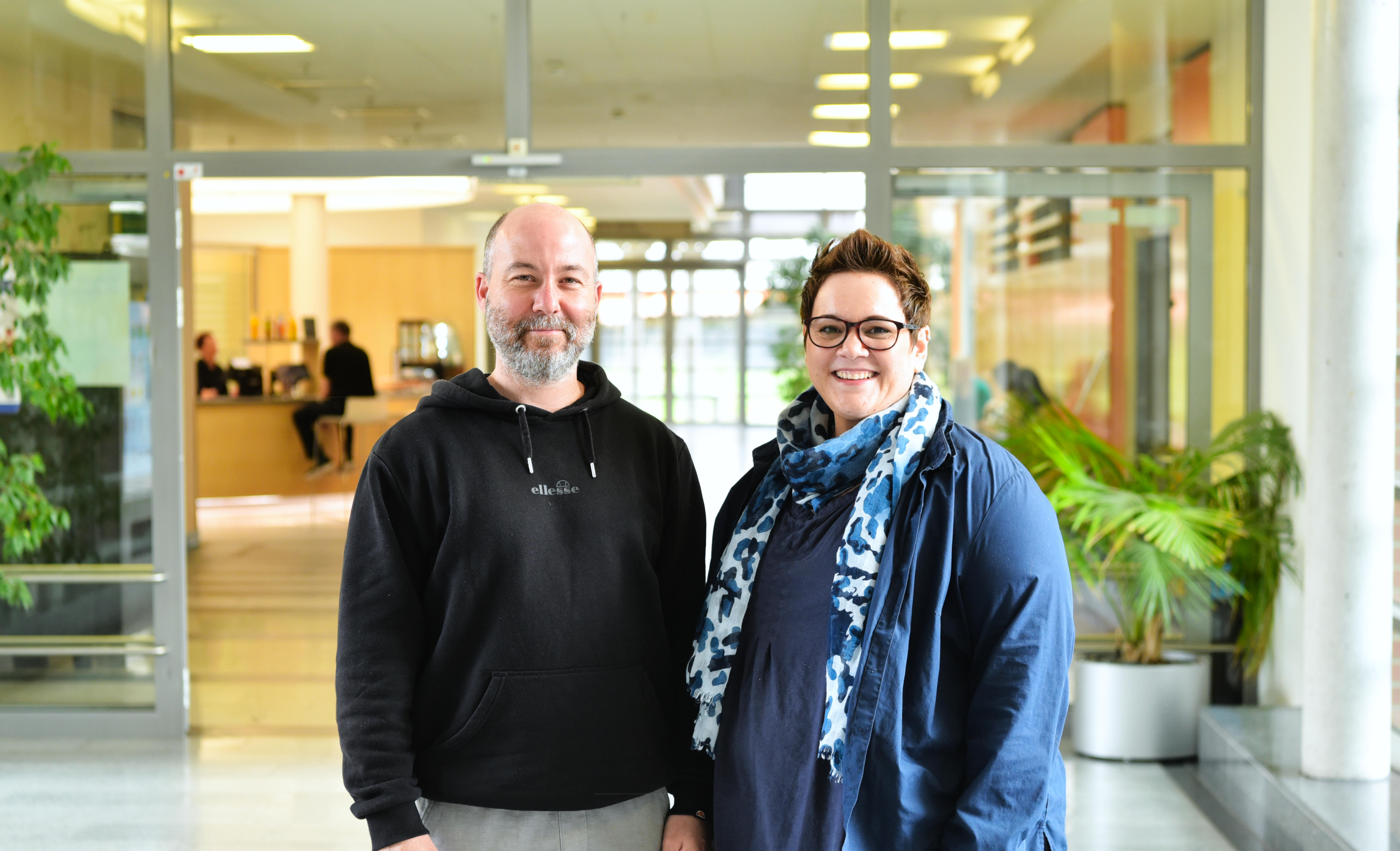 Bild 1: René Brodermann, Teamleiter der Dialyse- und Intensivpools, gemeinsam mit Saskia Söhrmann, Teamleiterin der Springer- und Stationssekretariatspools. Bildnachweis: BG Universitätsklinikum Bergmannsheil