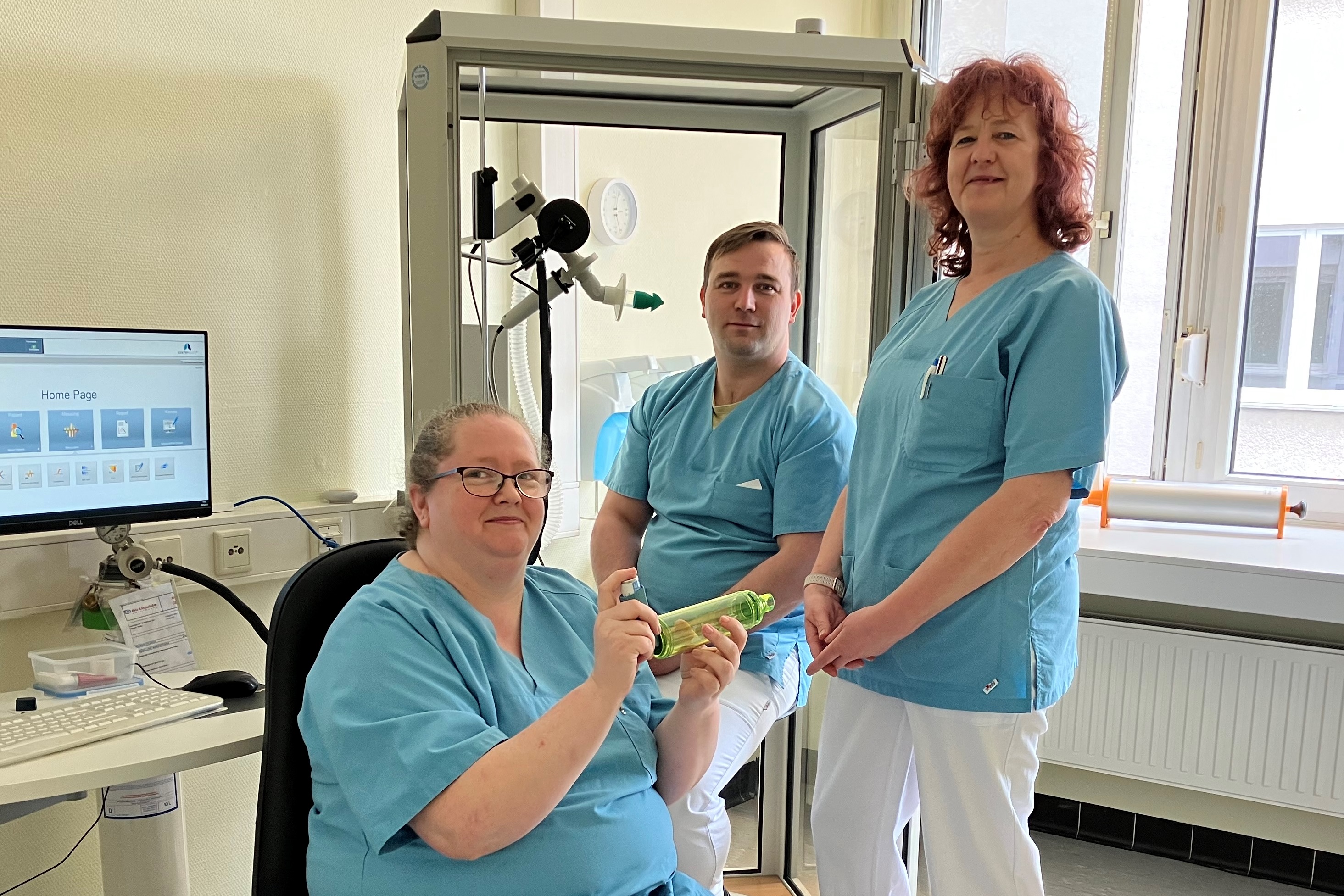 Das Team der Funktionsdiagnostik in der Lungenklinik kümmert sich unter anderem um den Lungenfunktionstest, der bei Asthma-Erkrankten durchgeführt wird. v.l.: Kathleen Cheshire, Stefan Nack (Leitung Funktionsdiagnostik), Claudia Theofel (Foto: Anja Haak DGD Lungenklinik Hemer)