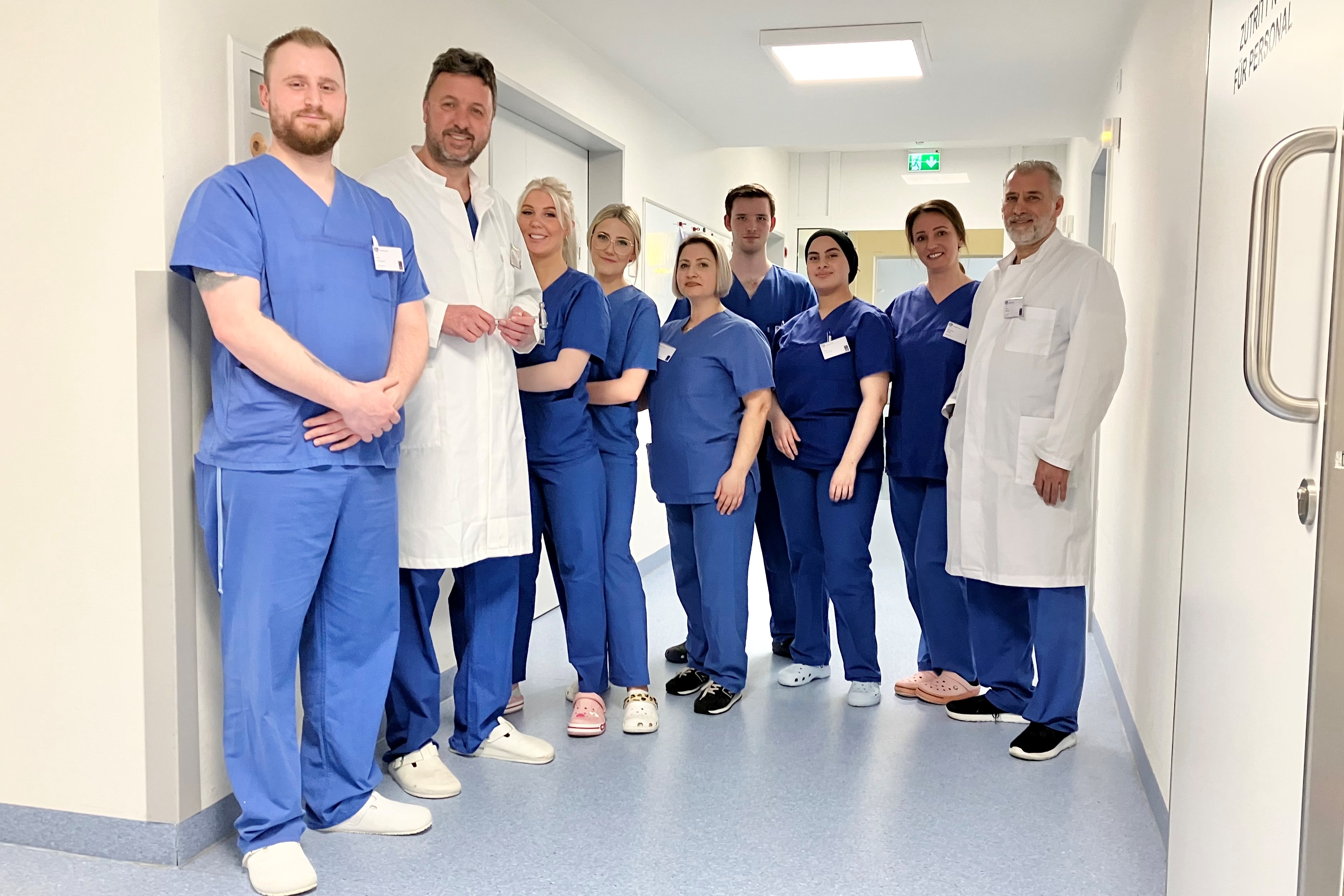 Das eingespielte Team aus Fachärzten und qualifizierten Pflegefachkräften versorgen betroffene Schlaganfall-Patienten rund um die Uhr in der Stroke Unit der DGD Stadtklinik Hemer; v.l. Emir Hasanovic (Pflegerische Leitung), Dr. Pieter Roelvink (Sektionsleiter der Neurologie), Jennifer Soldan (Fachkrankenschwester Stroke Unit), Sina Fitzner (Medizinische Fachangestellte), Filiz Ince (Krankenpflegeassistentin), Lukas Goldstein (Praktikant in der Pflege), Assia El-Fachtali (Pflegeschülerin), Hani Hajbaki (Leitender Oberarzt Neurologie) (Foto: Anja Haak, DGD Stadtklinik Hemer)